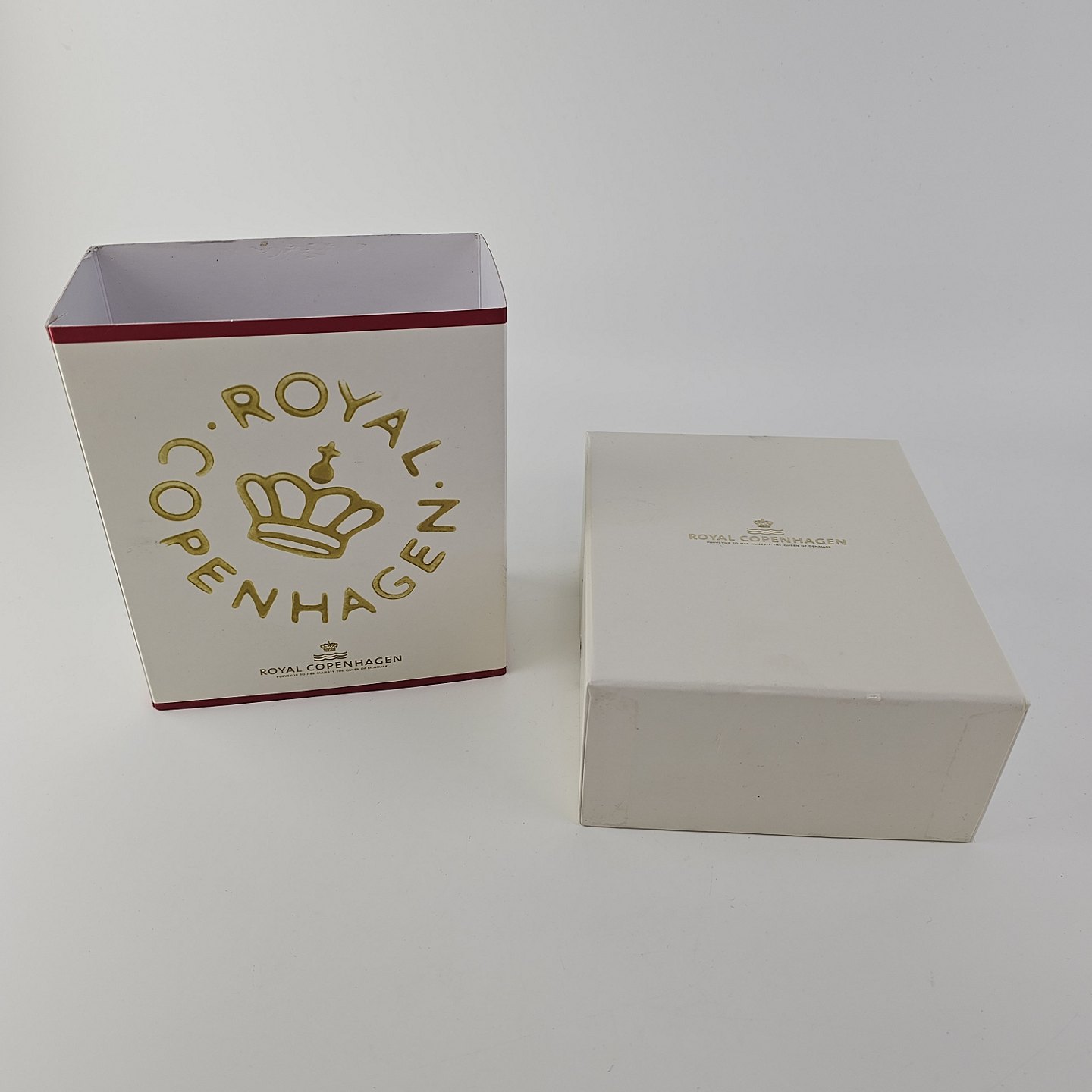 Juleornamenter i glas med motiv af en klokke og en aflang julekugle med rødt bånd til ophængI original kasse