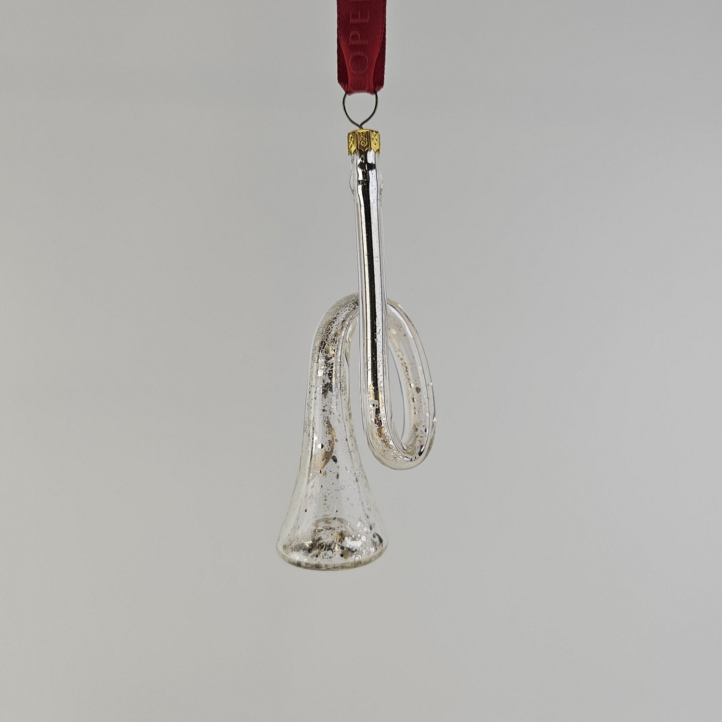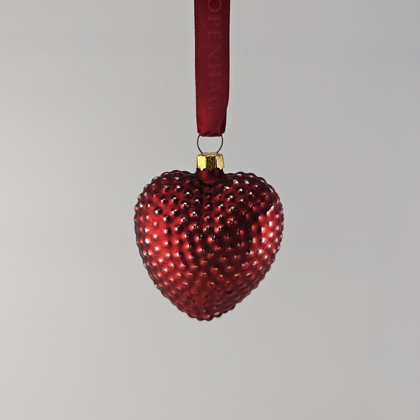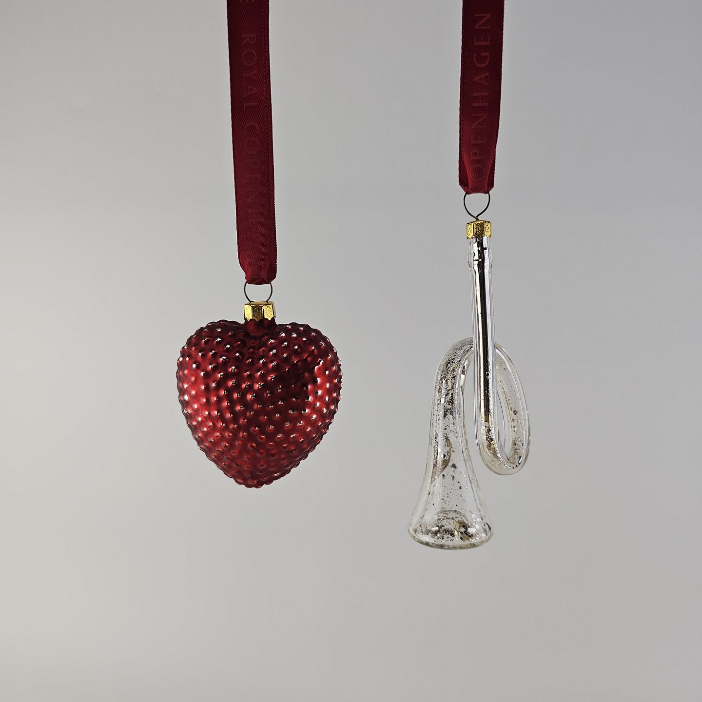 Juleornamenter i glas med motiv af et hjerte og en trompet med rødt bånd til ophængI original kasse