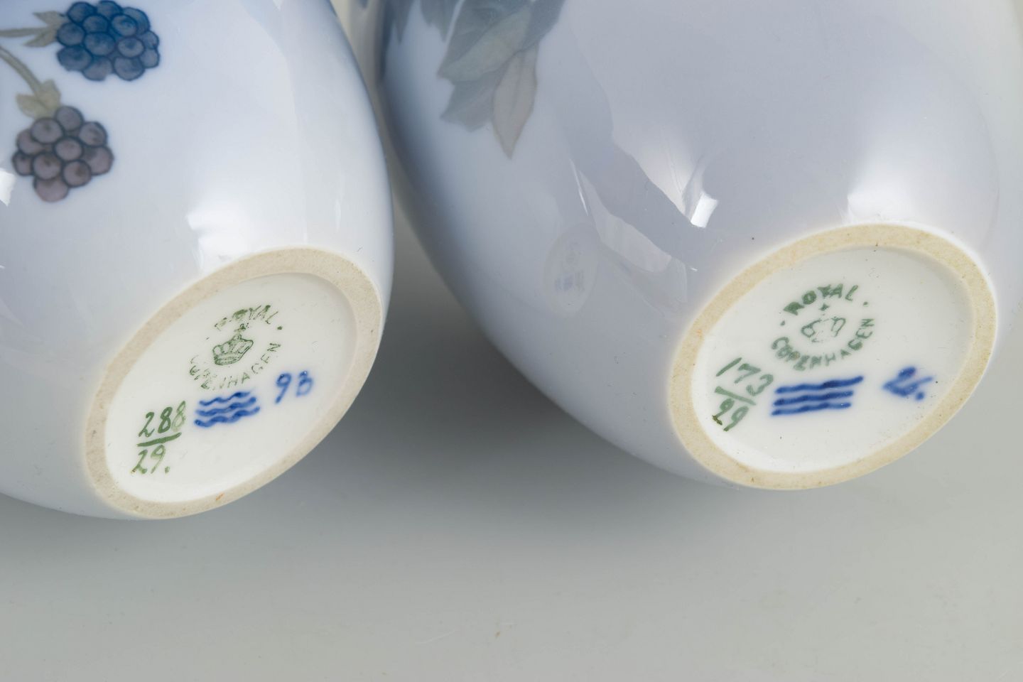 Royal Copenhagen, Art Nouveau vaser med hank, sæt af 2.Sæt bestående af to vaser i glaseret porcelæn med integrerede hanke og håndmalet underglasurdekoration i Art Nouveau-stil. Dekorationerne viser blomster- og bærmotiver i afdæmpede blå, grønne og rosa nuancer. Modeller 173/29 og 288/29.