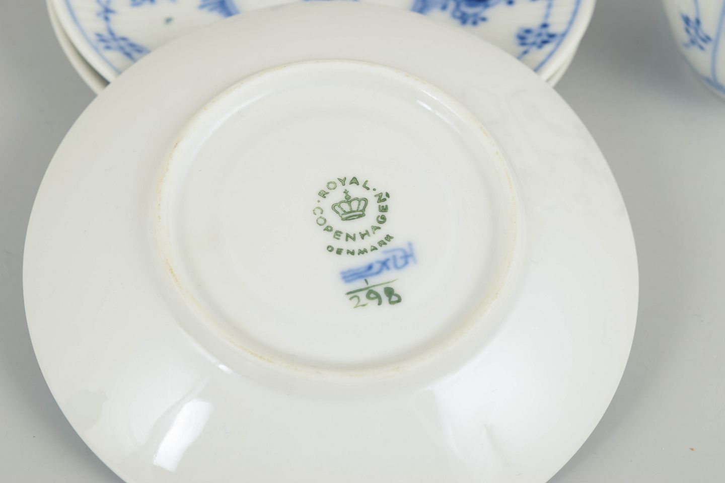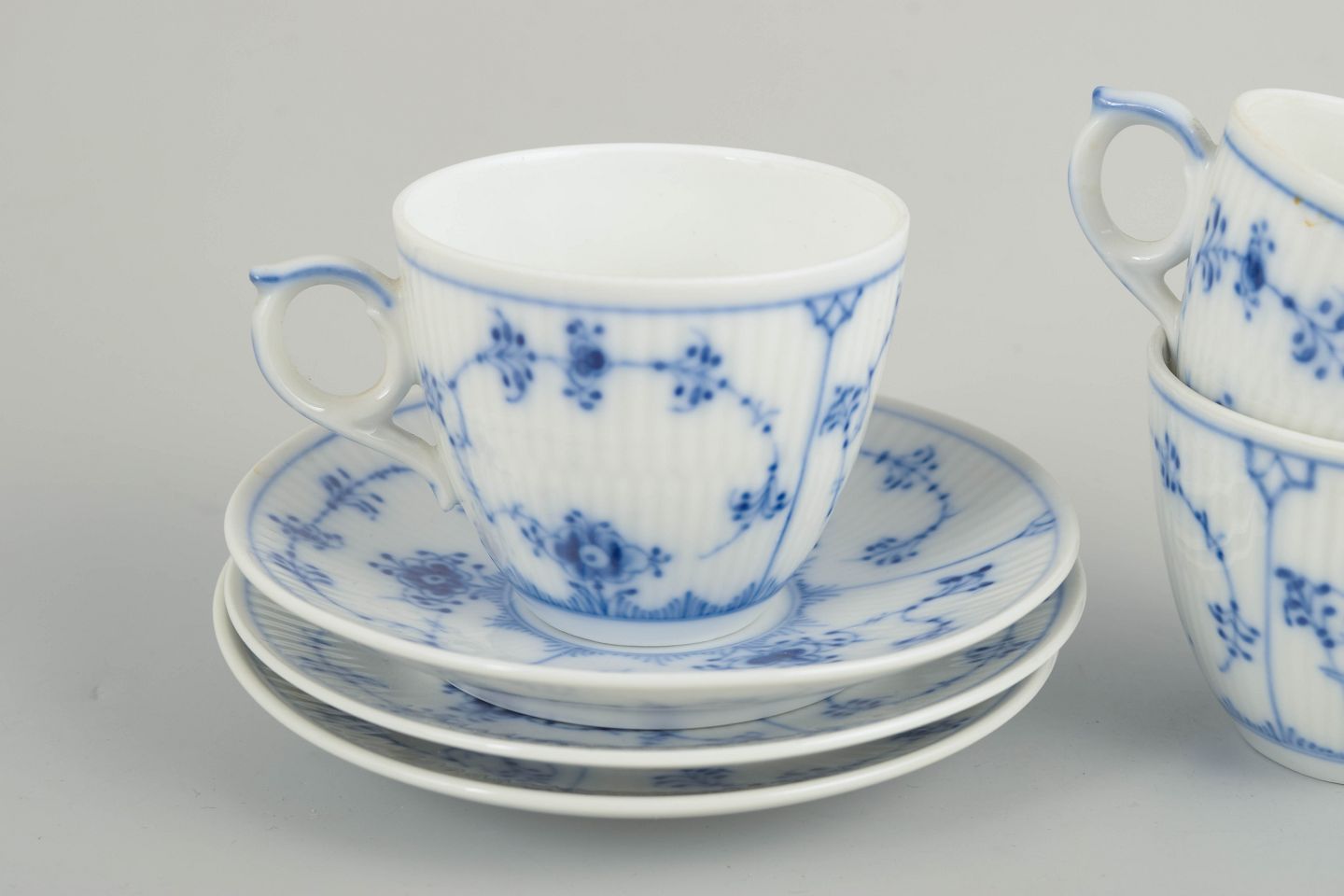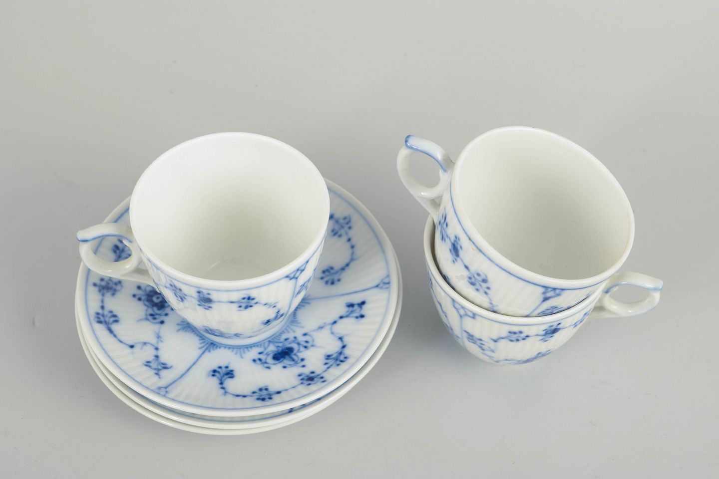 Royal Copenhagen, Musselmalet riflet kaffekopper med tilhørende underkopper, sæt af 3.Sæt bestående af tre kaffekopper med tilhørende underkopper i glaseret porcelæn, dekoreret med håndmalet underglasur i det klassiske musselmalede mønster. Model 1/298.
