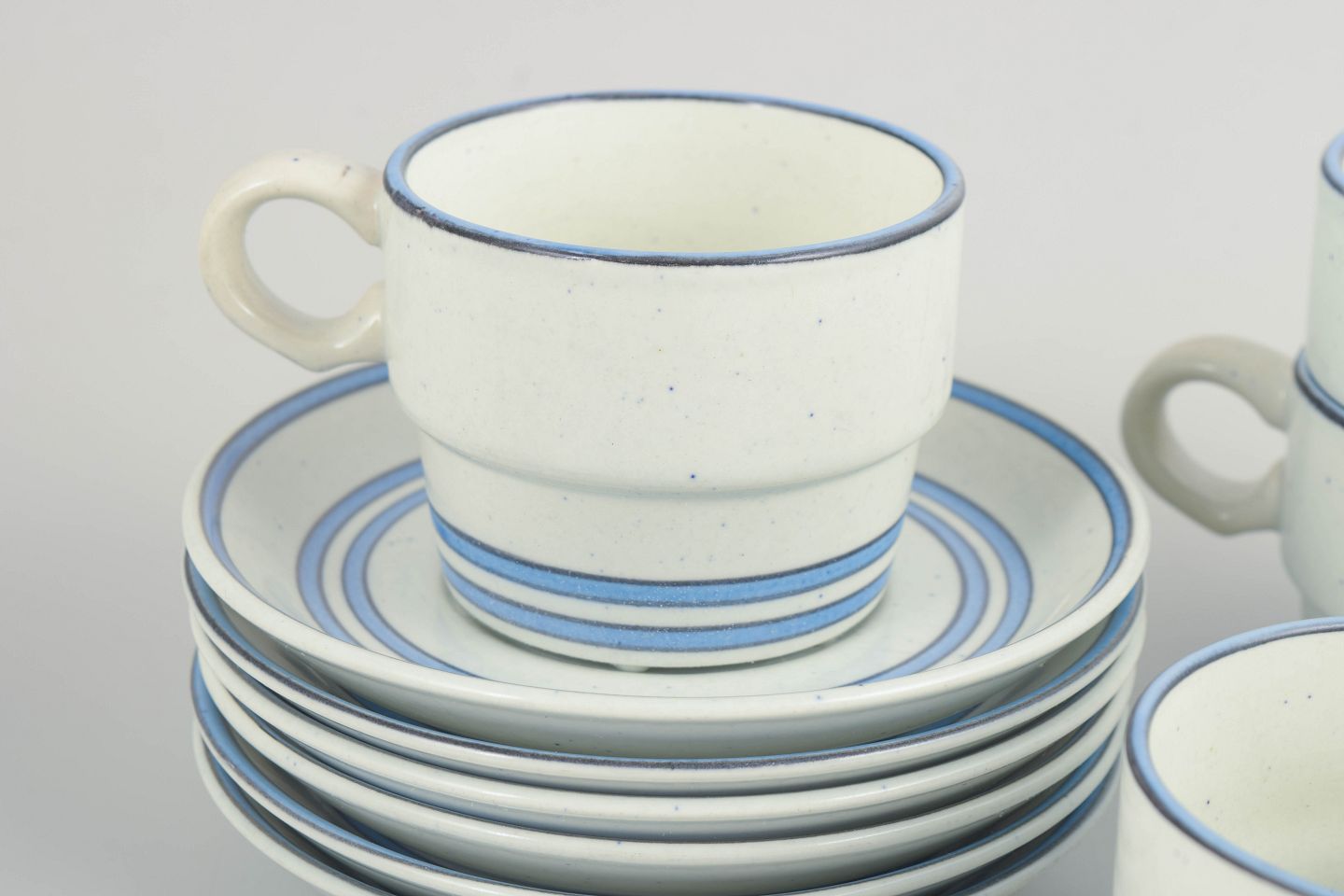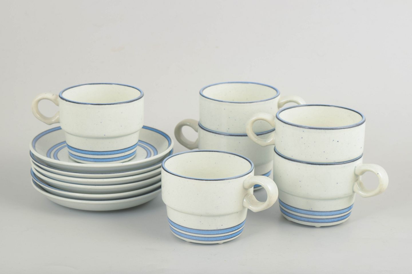 Stig Lindberg for Gustavsberg, kaffesæt.Sæt med seks kaffekopper med tilhørende underkopper i fajance. Serien er udført med enkle cylindriske former, let udadbøjede hanke og diskret dekoration i blå linjer på lys bund, karakteristisk for Stig Lindbergs funktionelle og grafiske formsprog. Udført efter Gustavsbergs model “Dart”.