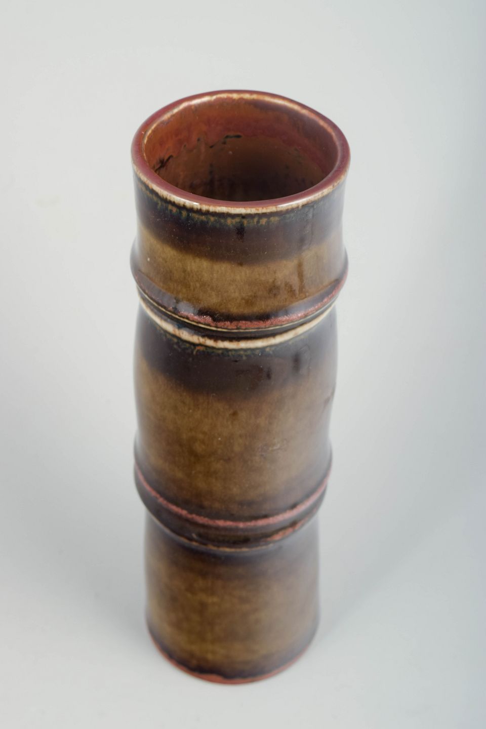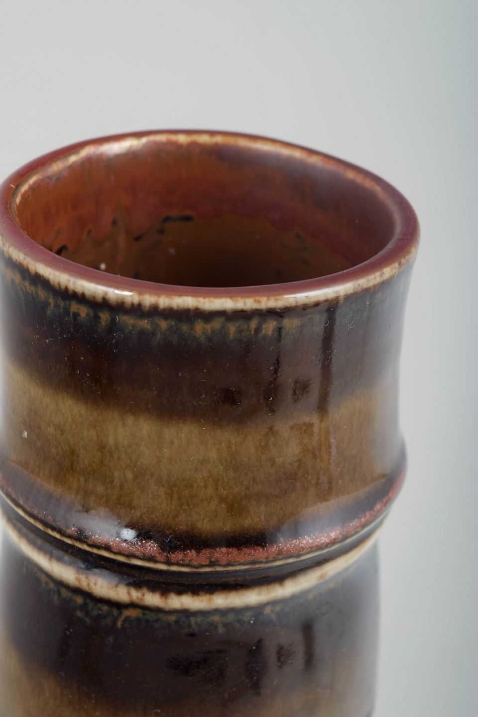 Olle Alberius for Rörstrand, vase.Slank, cylindrisk vase i stentøj med markant lodret formopbygning og let profilerede ringe. Overfladen er dækket af levende, løbende glasurer i varme brune, ravfarvede og beige nuancer med tydelig dybde og variation, karakteristisk for Rörstrands kunstneriske stentøjsproduktion i 1970’erne.