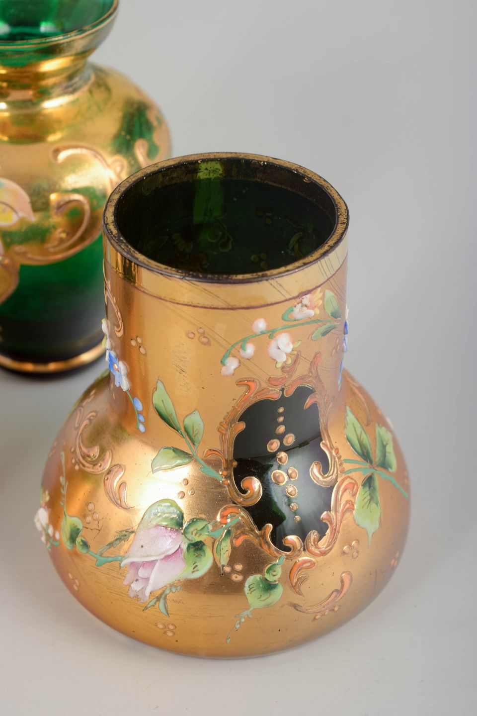 Bøhmisk glas, sæt med fire dele.Dekorativt sæt bestående af fire dele i grønt glas med rig guldfarvet dekoration og emaljemalede blomster. Sættet omfatter en lille kande, en klokkeformet del med knop, samt to vaser i varierende former. Håndlavet arbejde udført i Bøhmen, med tydelige variationer i form og proportioner.