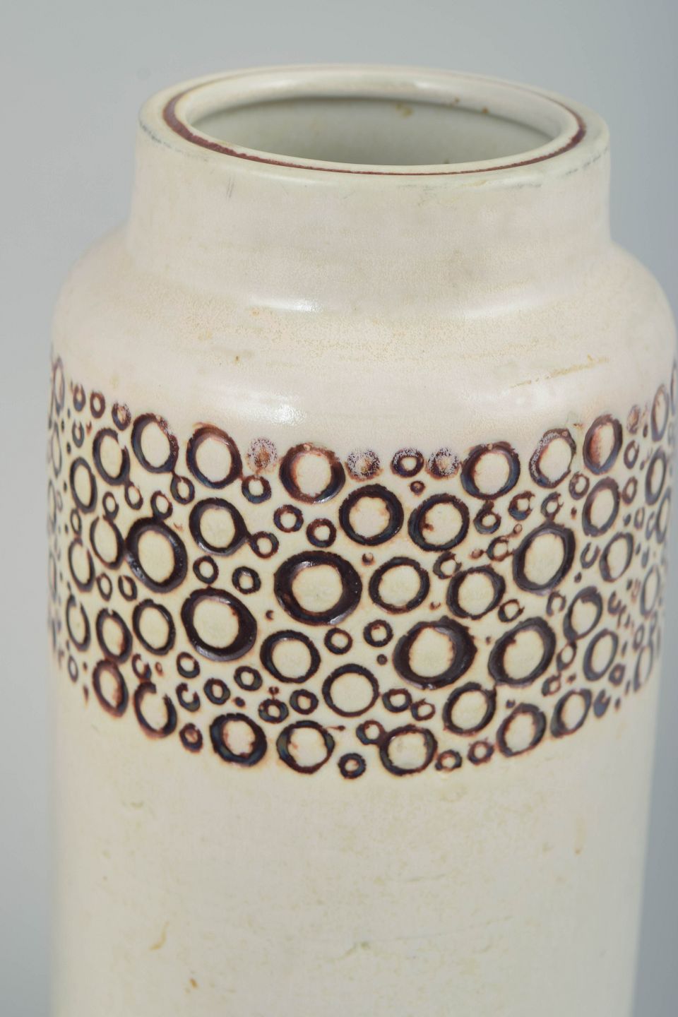 Cylinderformet vase i glaseret stentøj med hvid bund og dekorativ bånddekoration af brune cirkulære mønstre omkring skulderen. Enkelt og grafisk formsprog, typisk for Lisa Larsons produktion hos Gustavsberg i 1970’erne. Modellen indgår i Gustavsbergs dekorative stentøjsproduktion fra perioden.