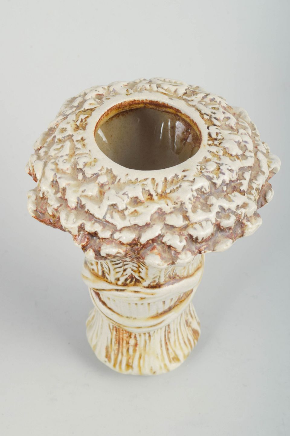 Höganäs, vase.Kraftfuldt formet vase i stentøj med markant reliefdekoration og kraftig, løbende glasur i cremefarvede og brune nuancer. Overfladen har et tydeligt, næsten barklignende udtryk, der understreger det skulpturelle formsprog. Signeret “KB” i bunden. Udført hos Höganäs Keramik og dateret til omkring 1960’erne.