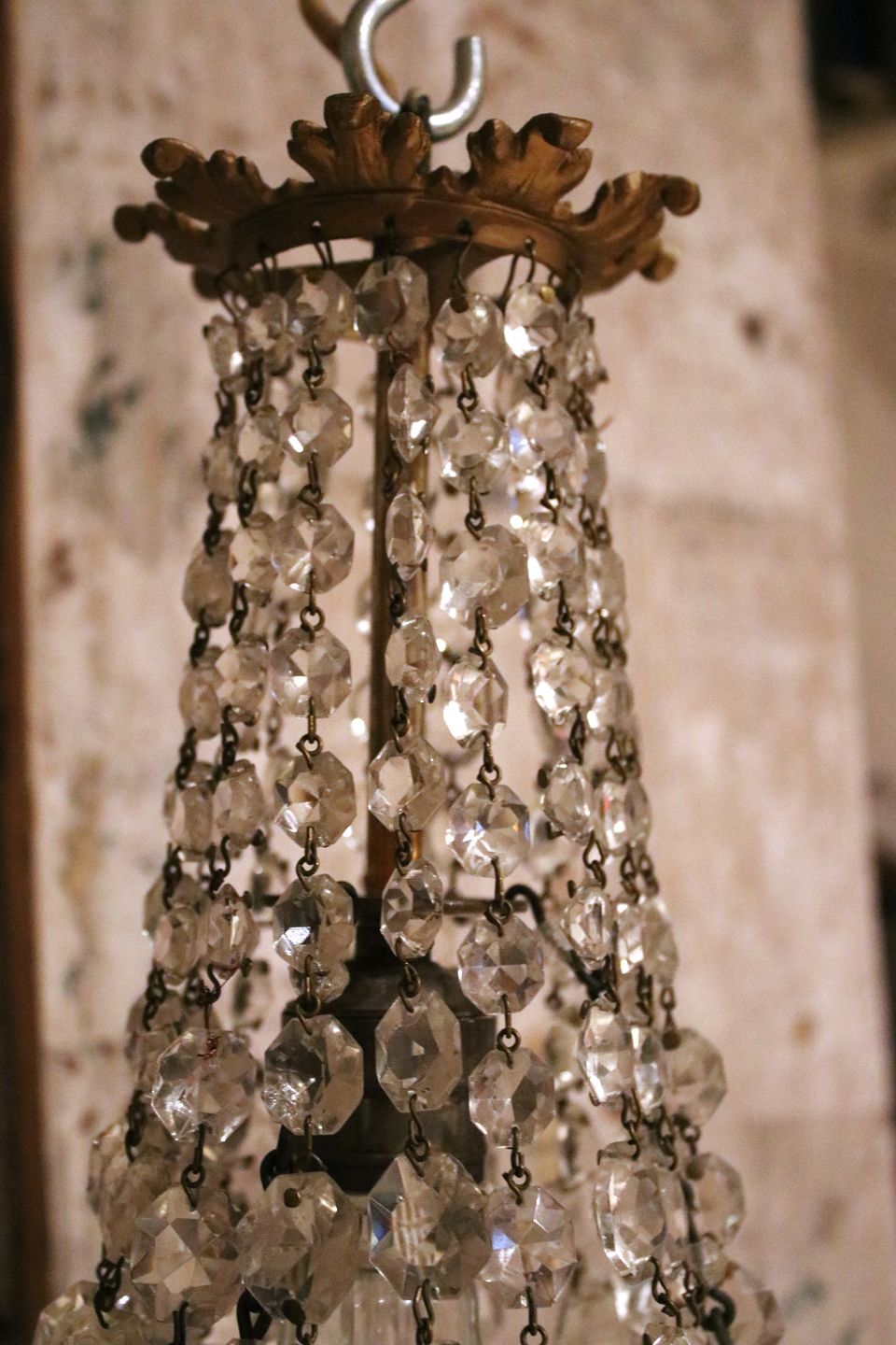 Gammel , mini prismelysekrone i bronze med klare slebne glas prismer.Lysekronen har en lyskilde i midten og er monteret med ny stofledning.