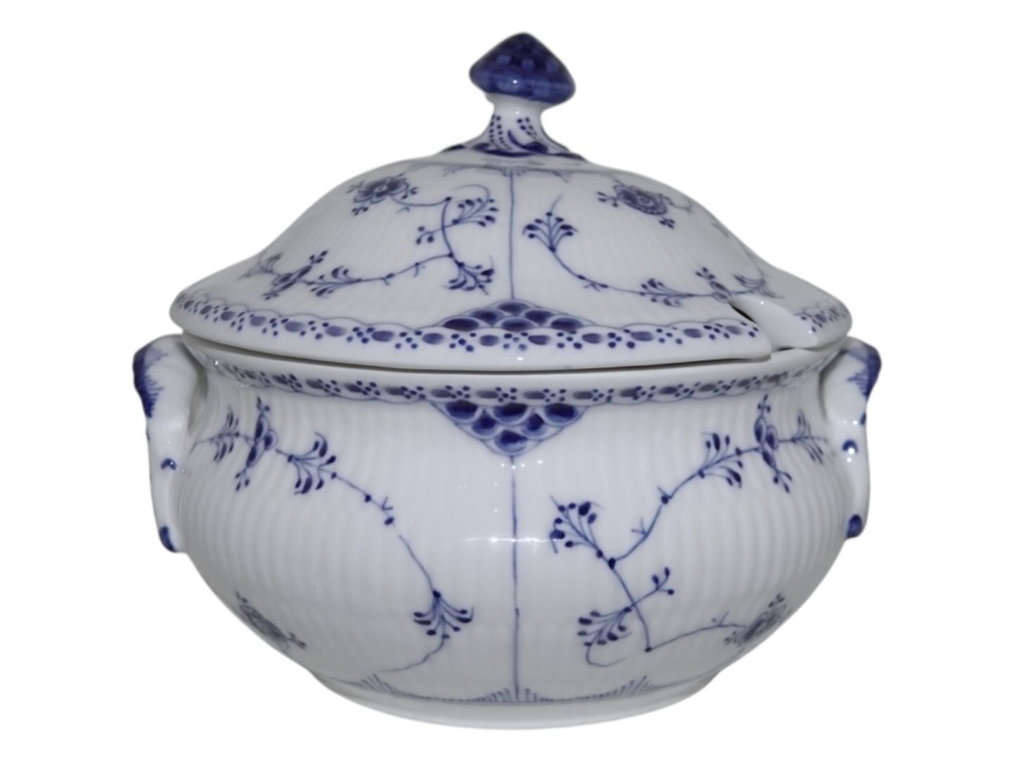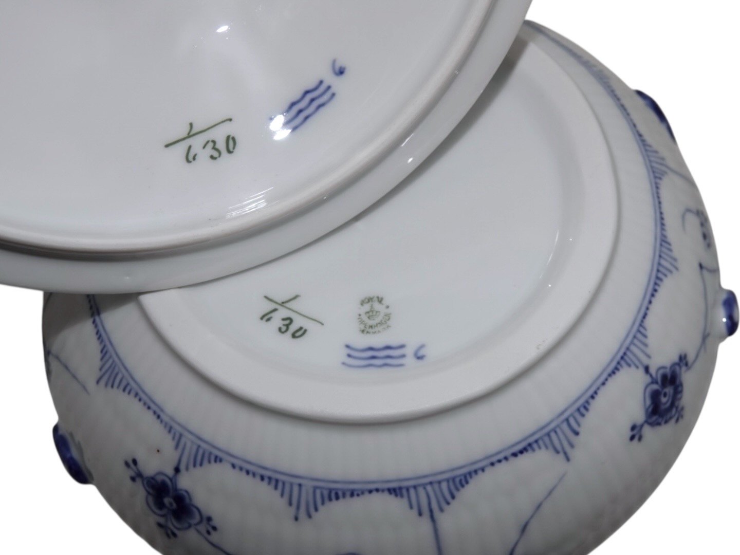 Kongelig Musselmalet Halvblonde, sjælden lille rund suppeterrin med låg.Af fabriksmærket ses det, at denne er produceret mellem 1923 og 1928.