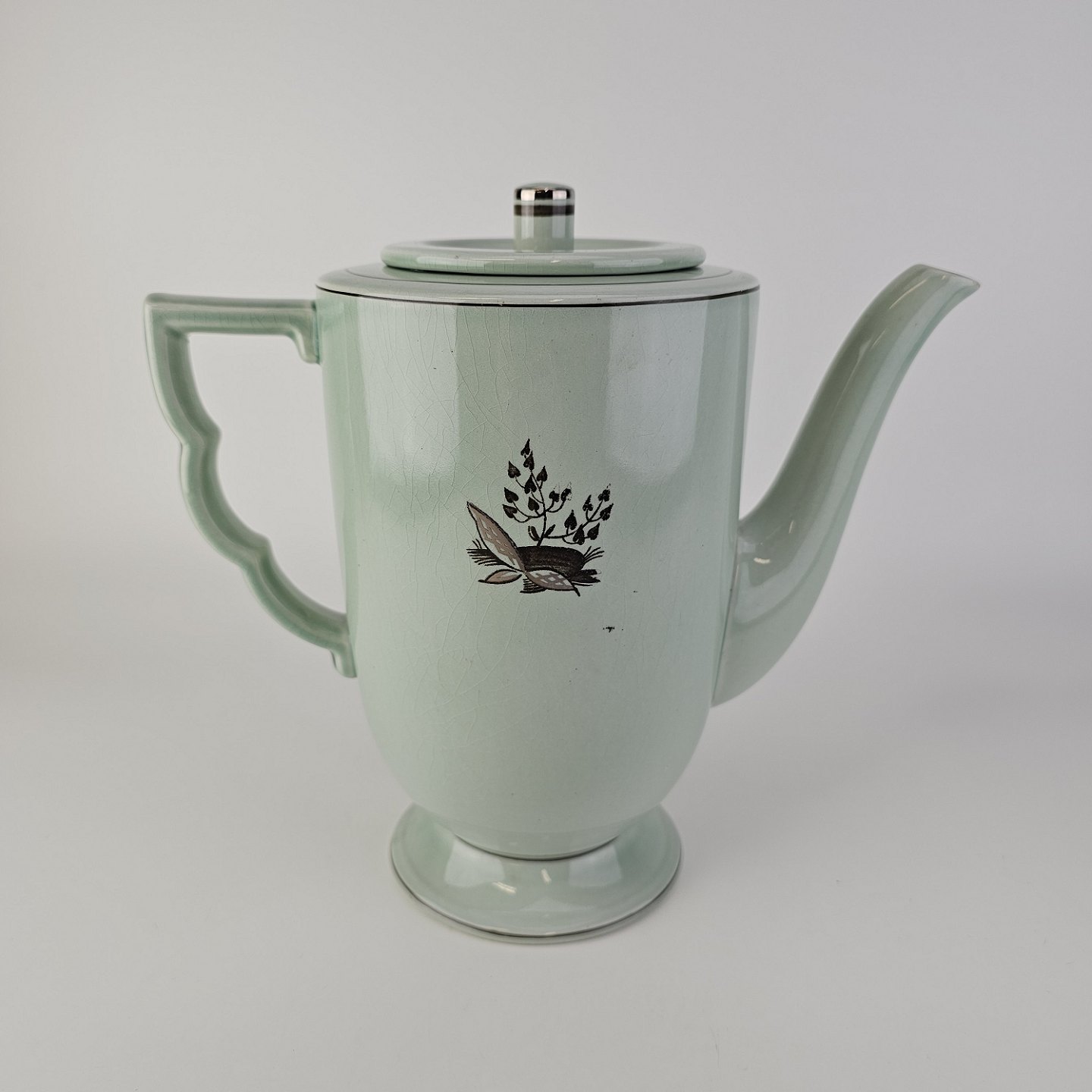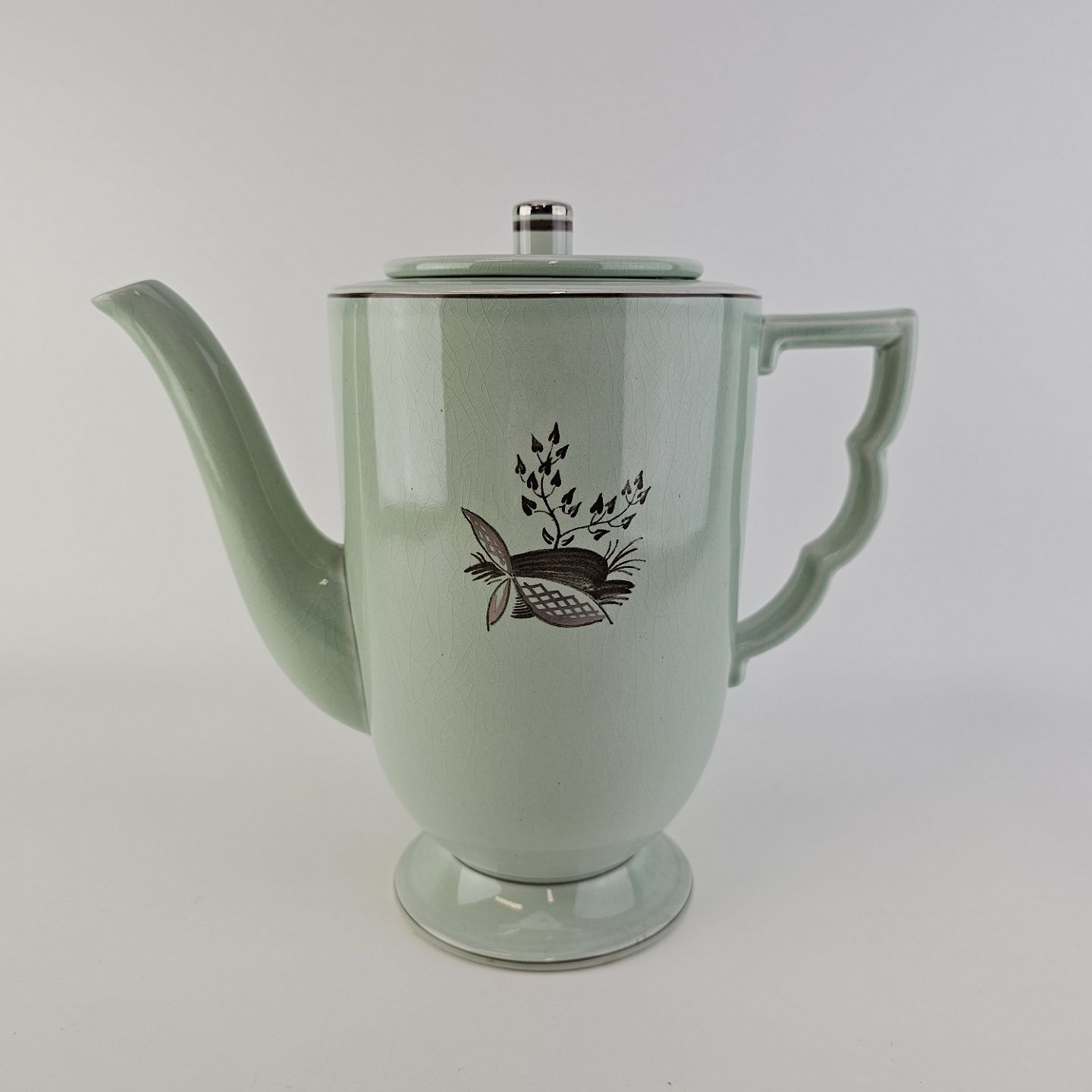 Stel i lysegrøn fajance med natur dekoration og flettet kant