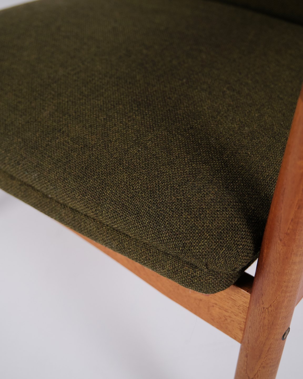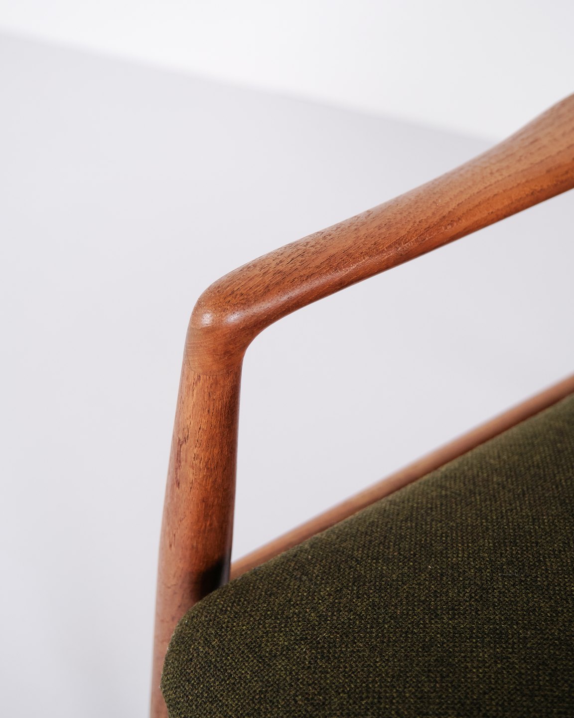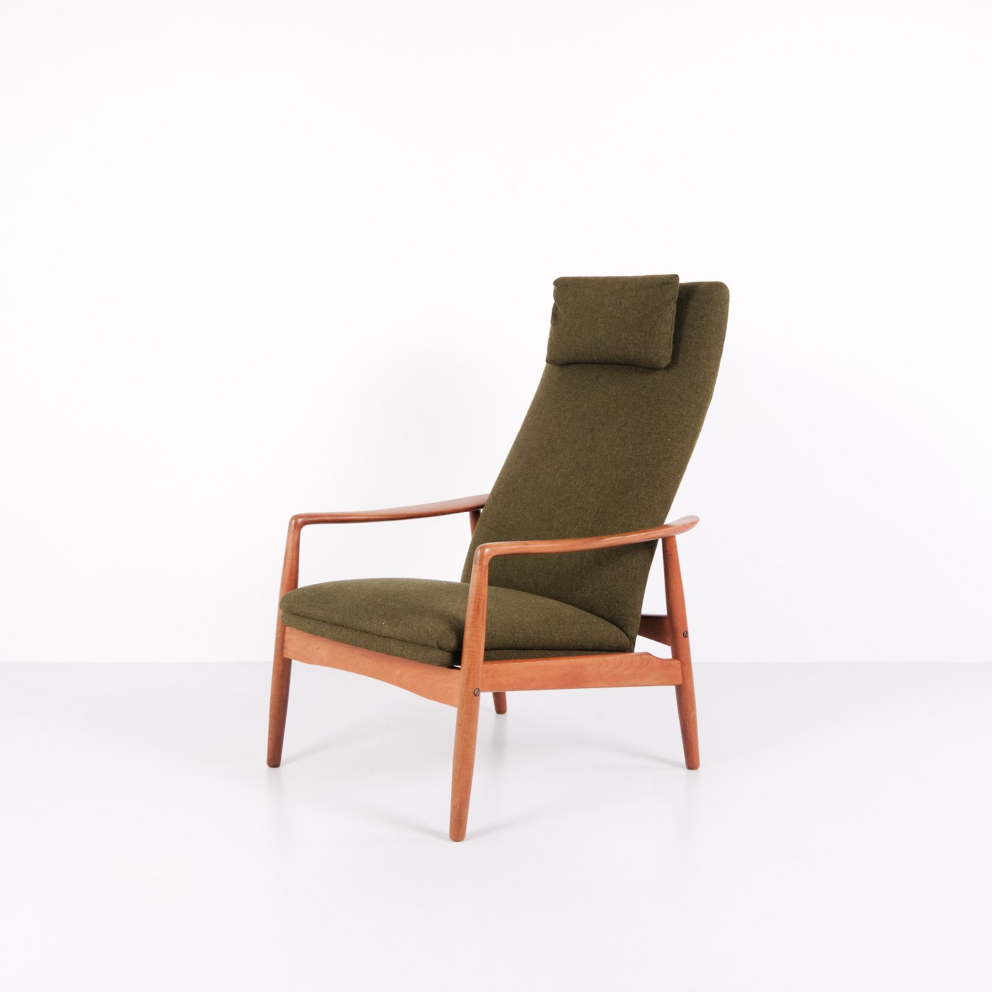 Et par hvilestole med skammel designet af Alf Svensson for Fritz Hansen. Teaktræ og grønt stof. Skandinavisk design fra 1960’erne med fokus på komfort.— Oprindelse: Danmark