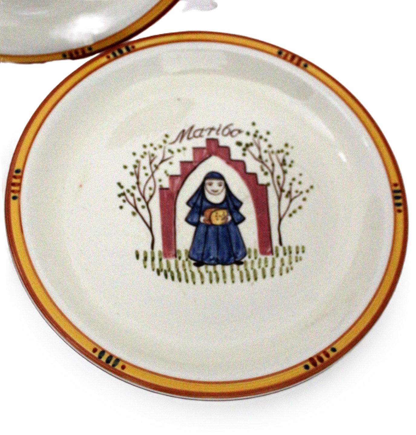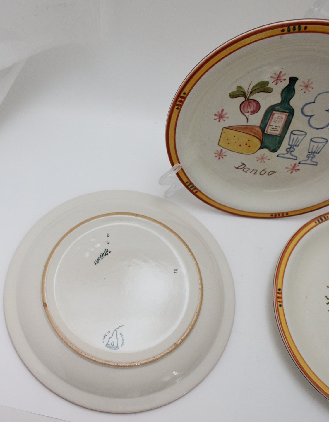 Knabstrup, Ostestellet. Formgivet af Johannes Hansen i 1959 og dekoreret af Paul Høyrup. Motiv og navn for de forskellige danske ostetyper, Fynbo, Molbo, Danbo, Maribo, Esrum og Samsø.Ostetallerken. Nr. 205. Diameter 22 cm. Fin stand med let brugsslid. Pris: 175 kr. stk.