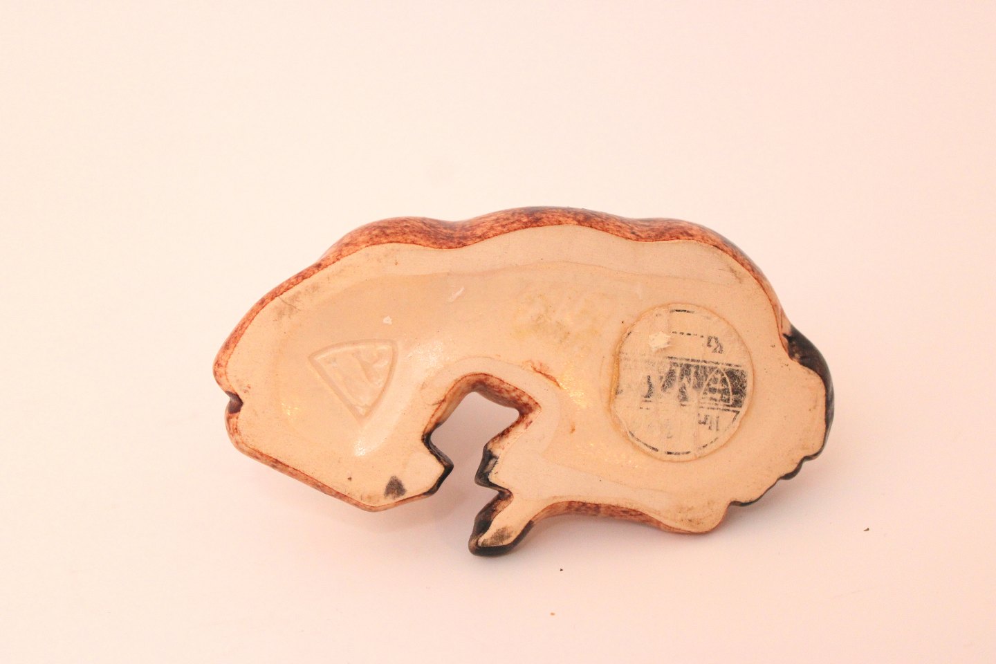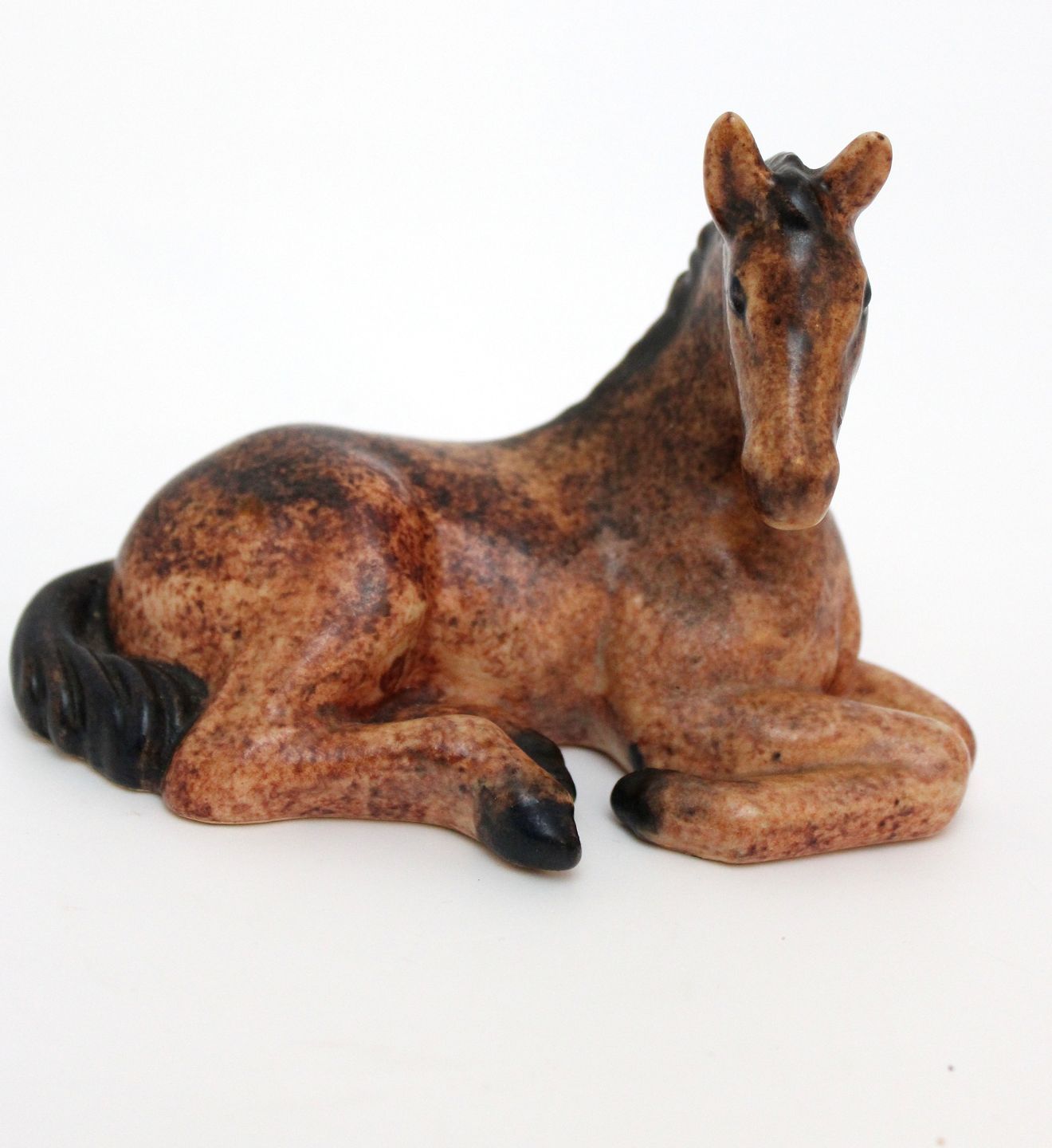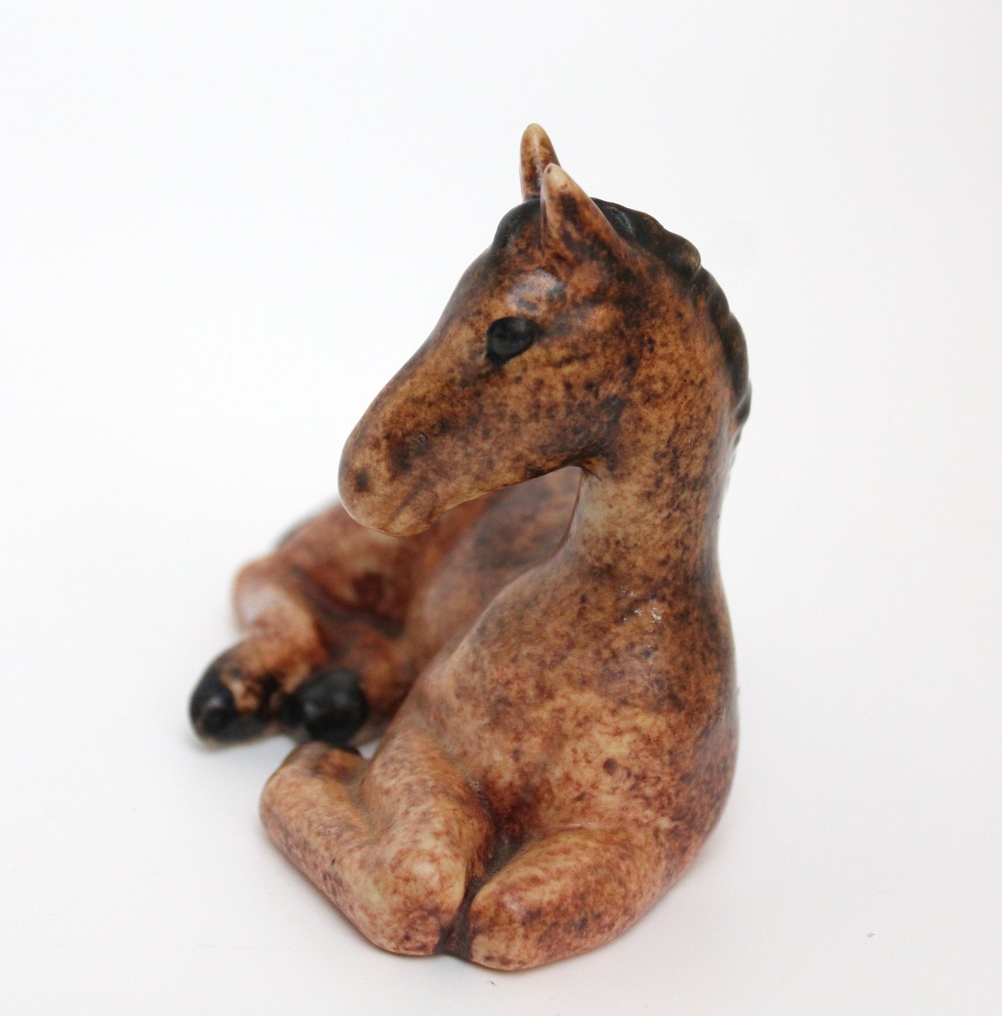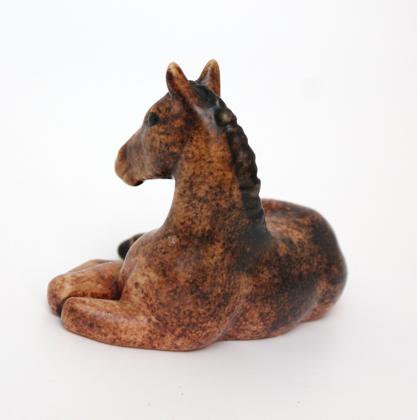 Michael Andersen, Bornholm, Lille liggende føl i brun glasur. Stempel + det gamle klistermærke. Længde 12 cm. Højde 8 cm. Flot stand. Pris: 450 kr. Udstiller