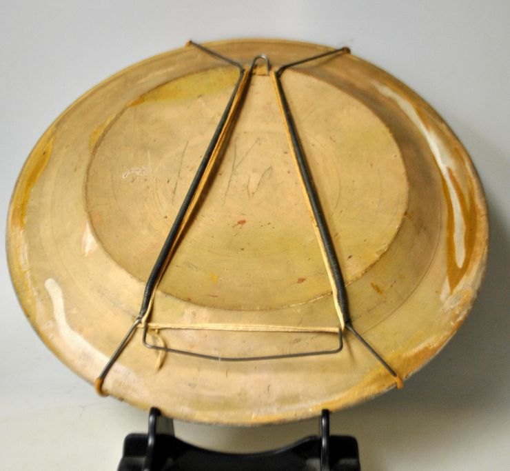 Dansk keramiker (1906): Mindeplatte i keramik for Chr. IX (1863-1906), 1906. Hvid, blå og gul glasur. Med Chr. IX monogram og valgsprog: Med Gud for ret og ære. Dia: 27,5 cm.Virkelig sjælden!