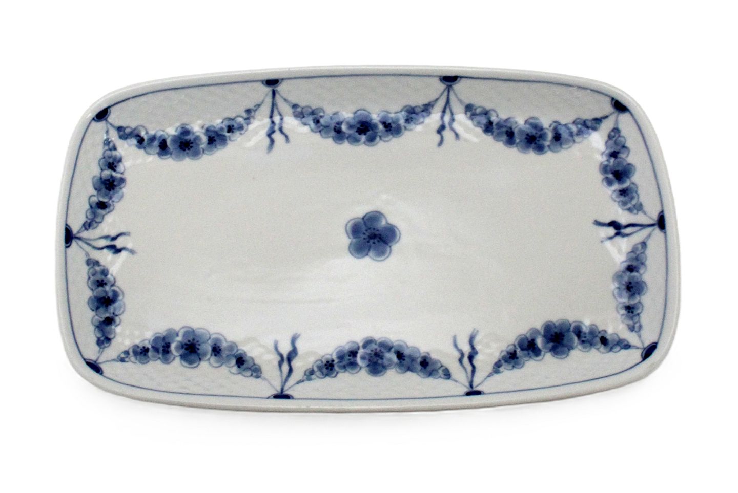 Bing & Grøndahl, Empire, hvidt porcelæn med blå ranker.Aflang bakke til sukker og fløde. Kan bruges som serveringsfad eller spisetallerken. Nr. 96. II. sortering. Fin stand. 27 x 15,5 cm. Pris: 250 kr.