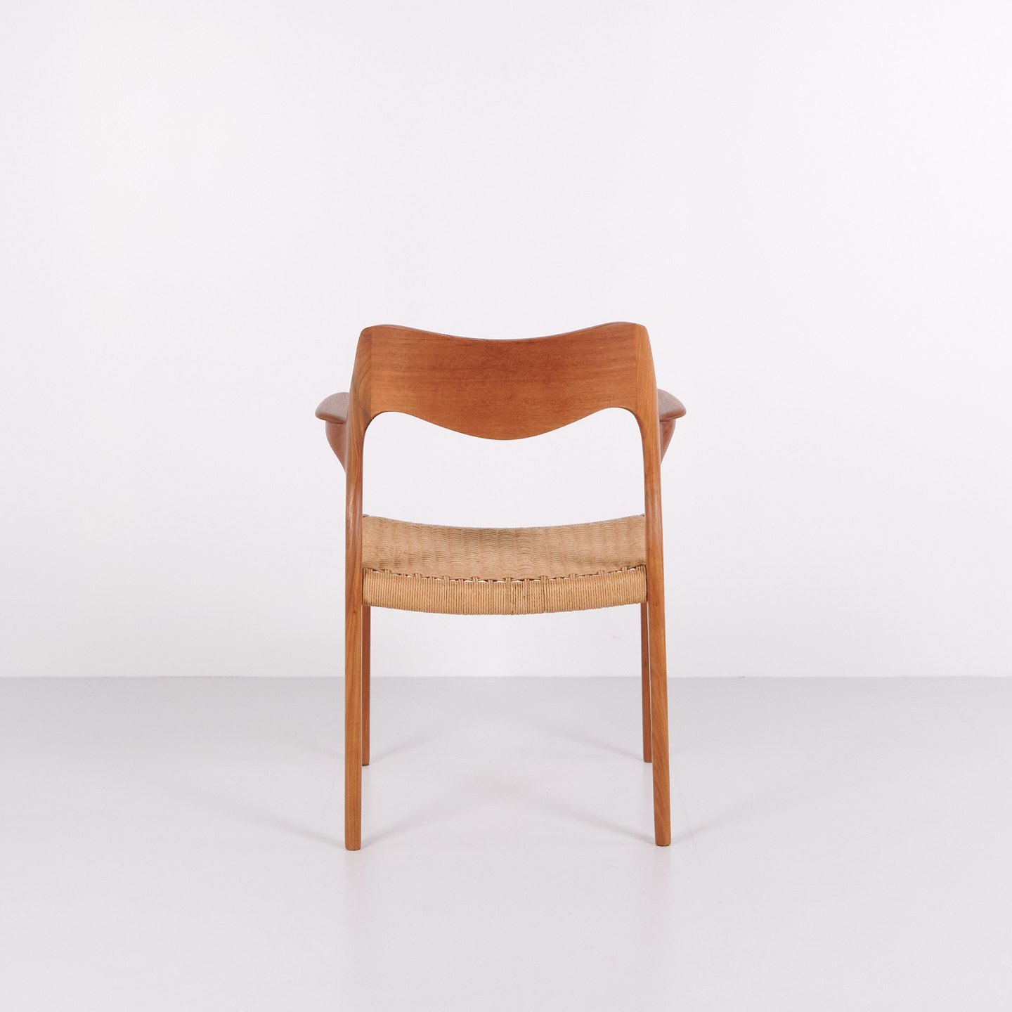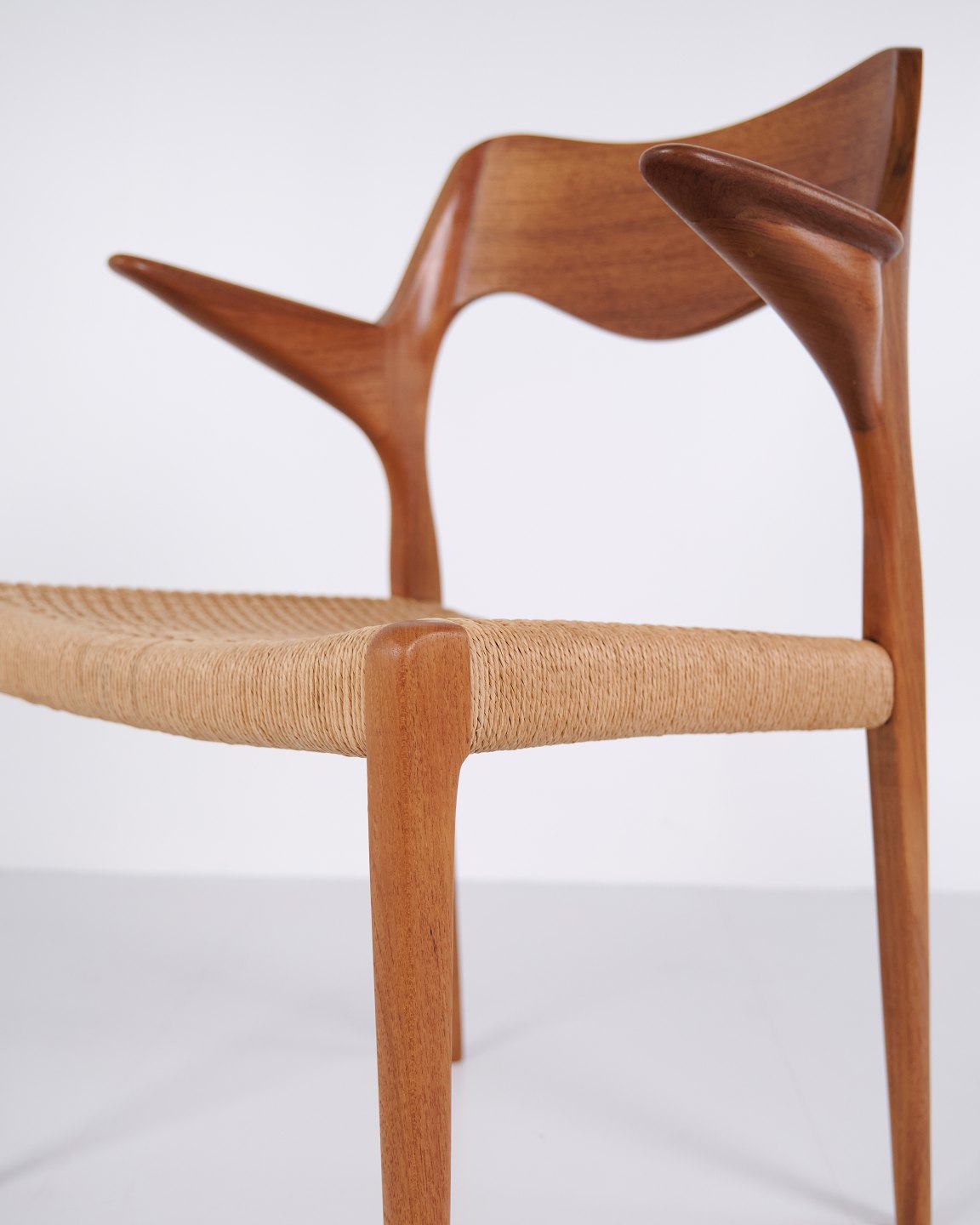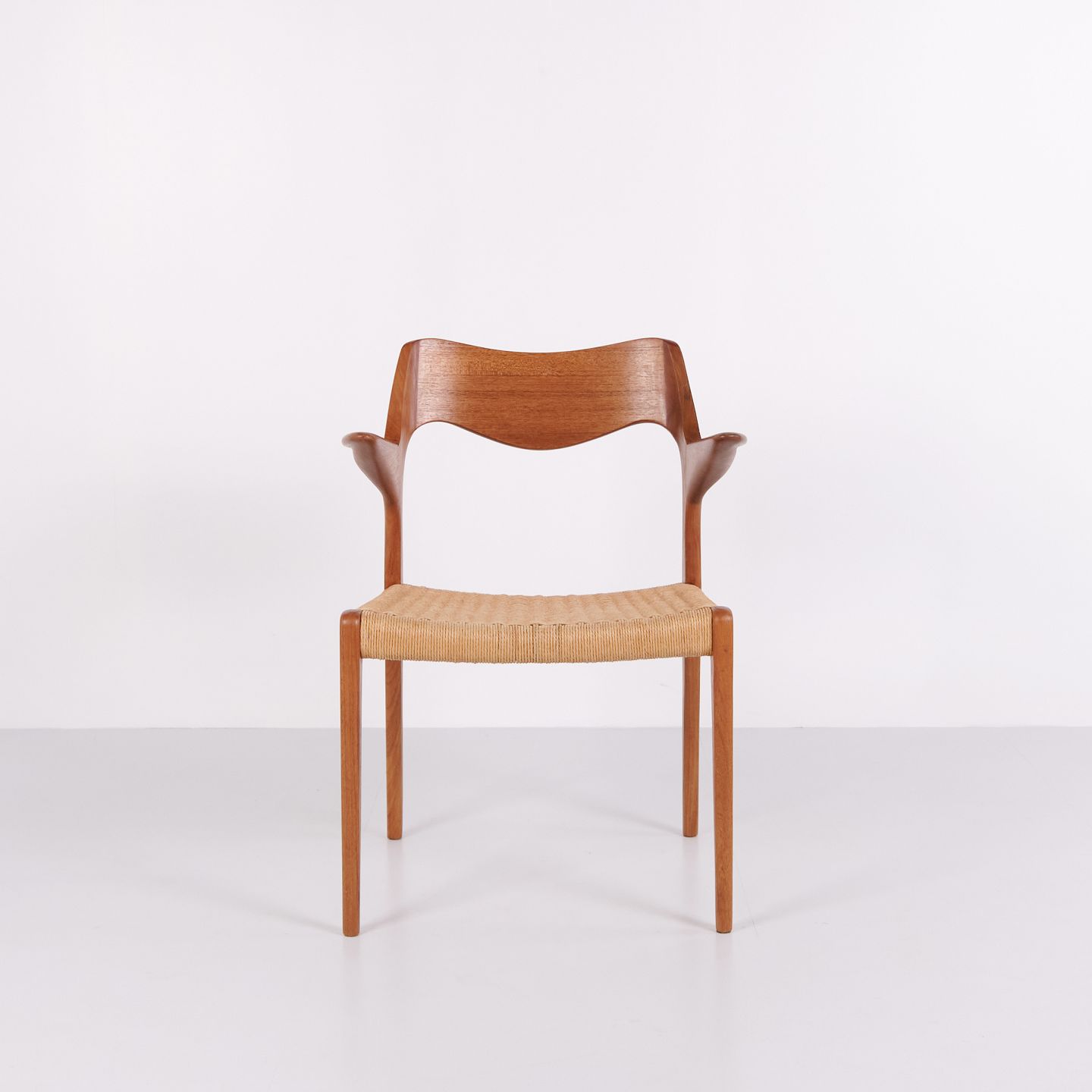 Model 55 spisebordsstol af N.O. Møller for J.L. Møllers Møbelfabrik i teak og flet fra 1960’erne. Dansk design klassiker.— Designer: N.O. Møller