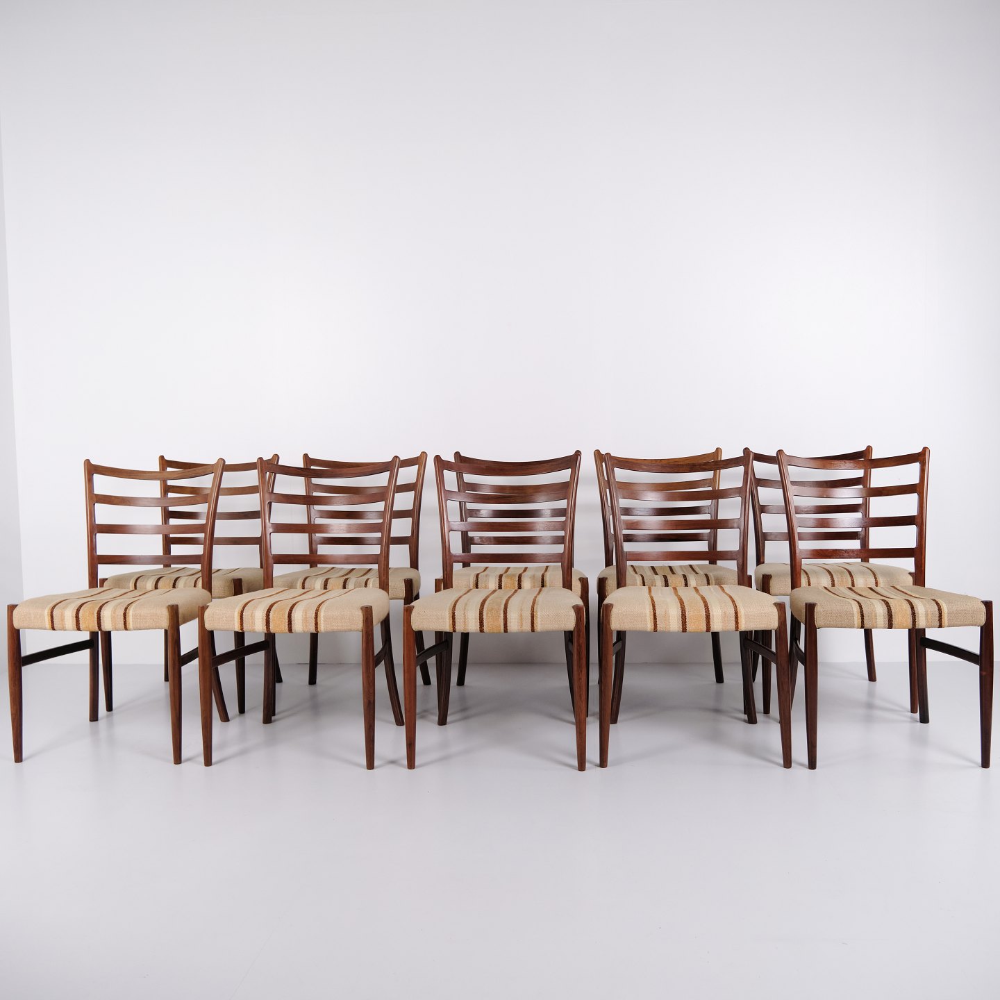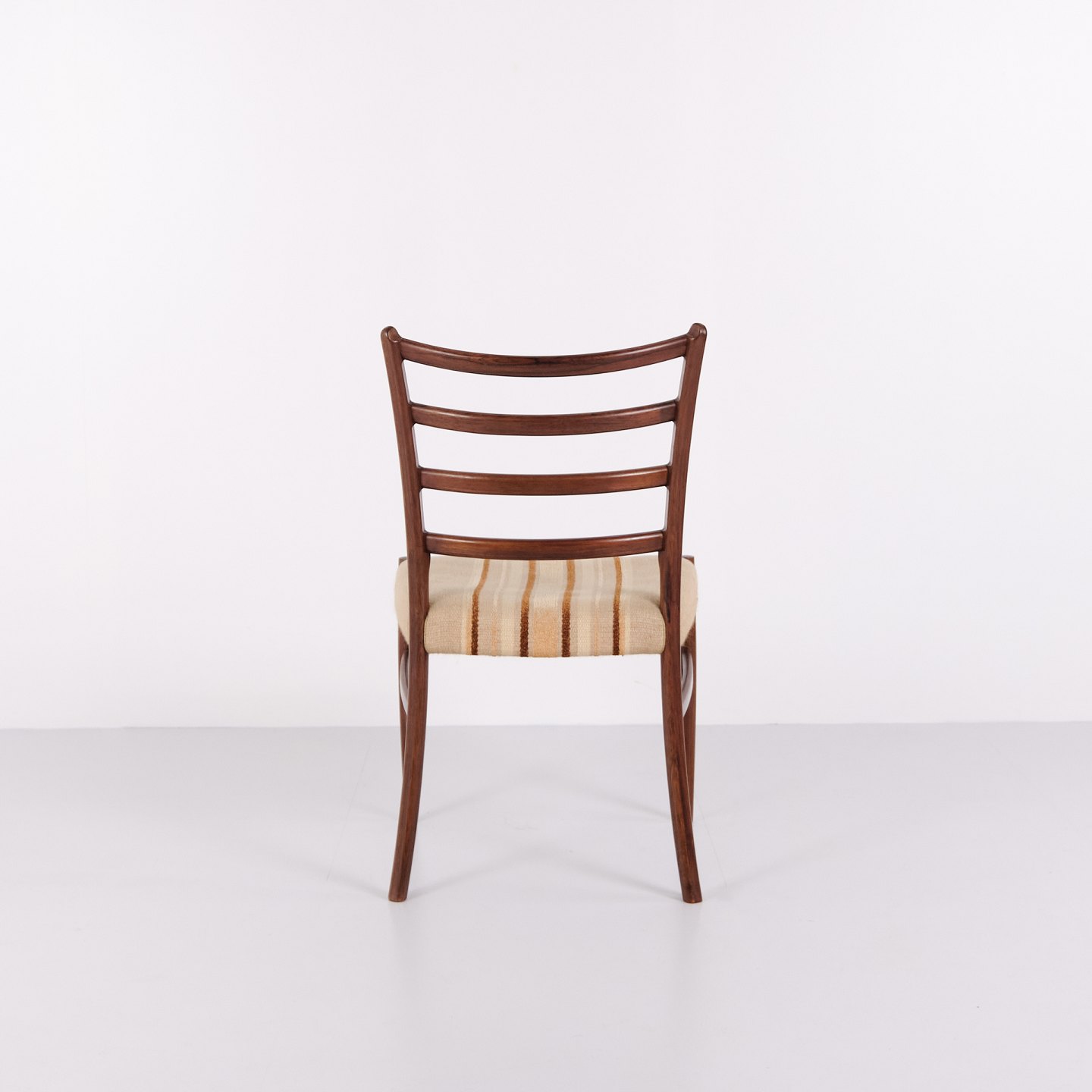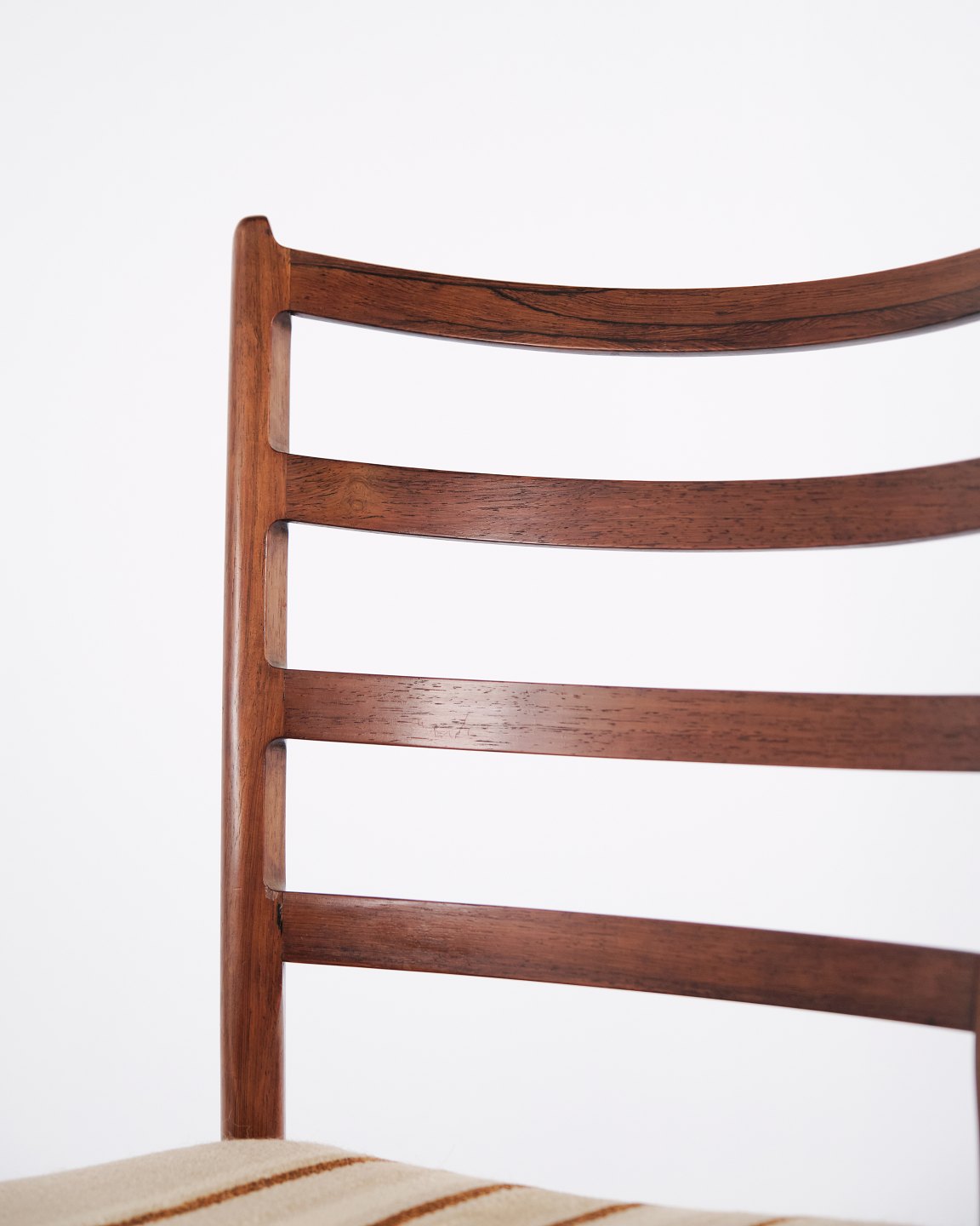 N.O. Møller spisebordsstole i palisander med stribet polster fra 1960’erne. Design af J.L. Møllers Møbelfabrik.— Designer: N.O. Møller