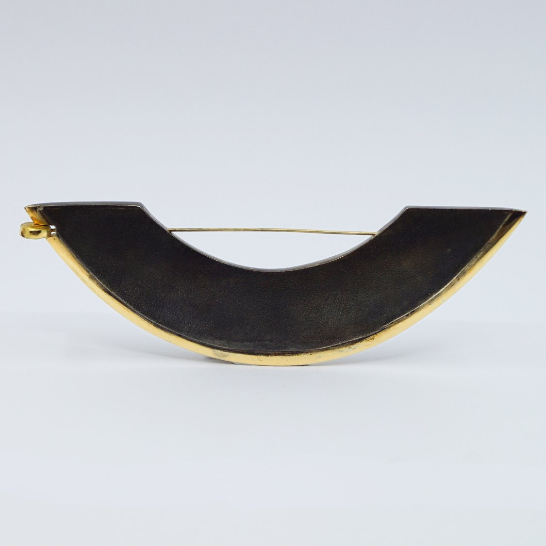 Anette Kræn; Stor kraftig sølv broche med oxideret overflade og 14 kt. guld. Kan vendes på to forskellige måder, med hver sit udtryk.L. 12,5 cm. H. 4 cm.