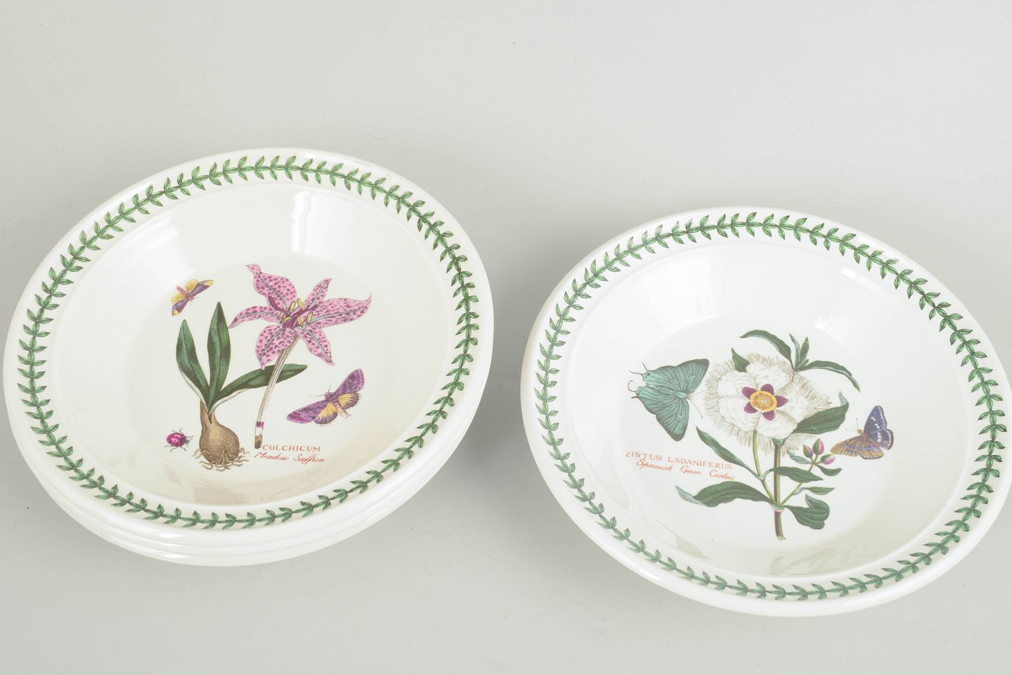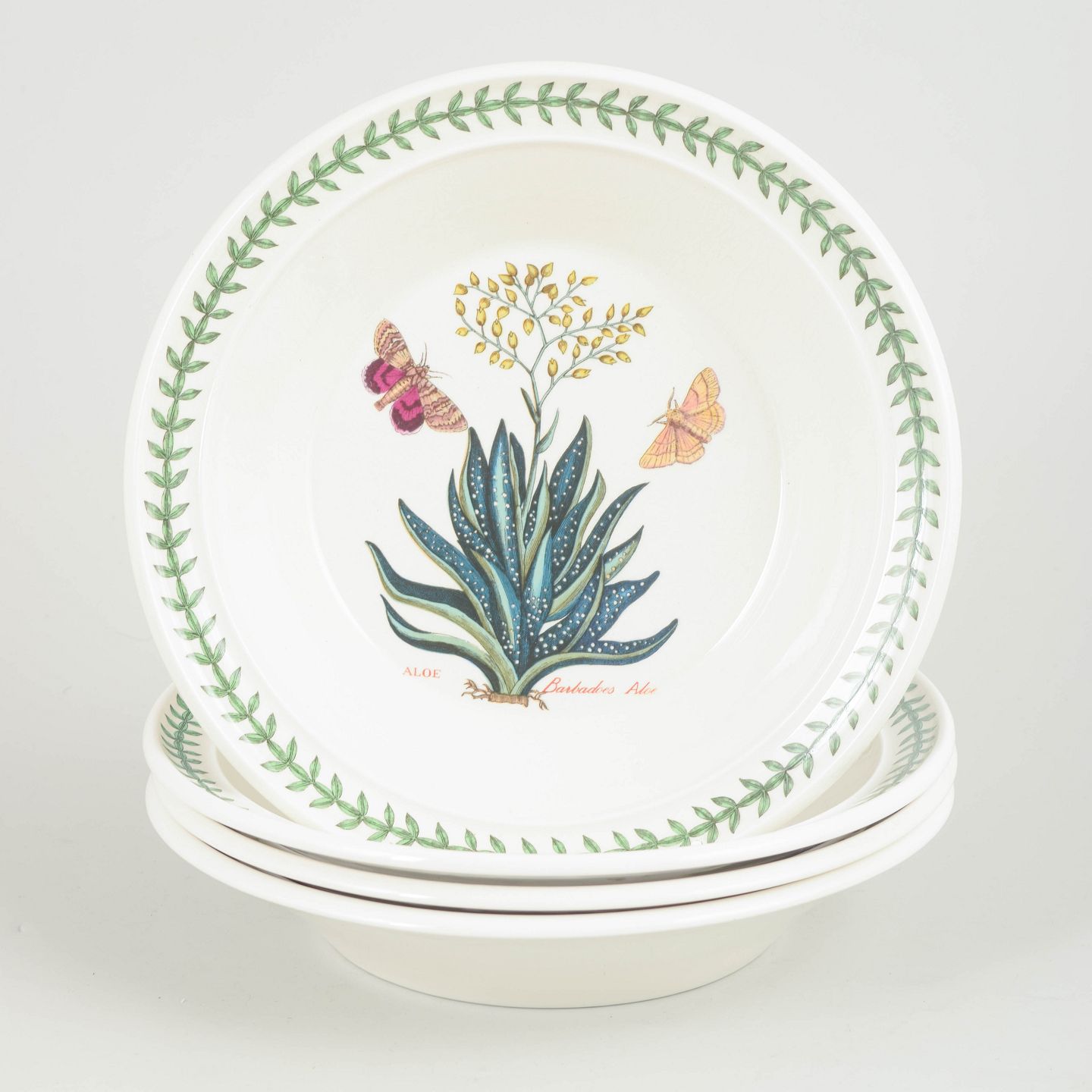 Portmeirion er en engelsk producent kendt for dekorativt stentøj og fajance med naturinspirerede dekorationer. “The Botanic Garden” serien tager udgangspunkt i klassiske botaniske illustrationer gengivet i klare farver og kombineret med en grøn bladbort, hvilket har givet serien et tidløst udtryk og gjort den populær blandt samlere gennem flere årtier.