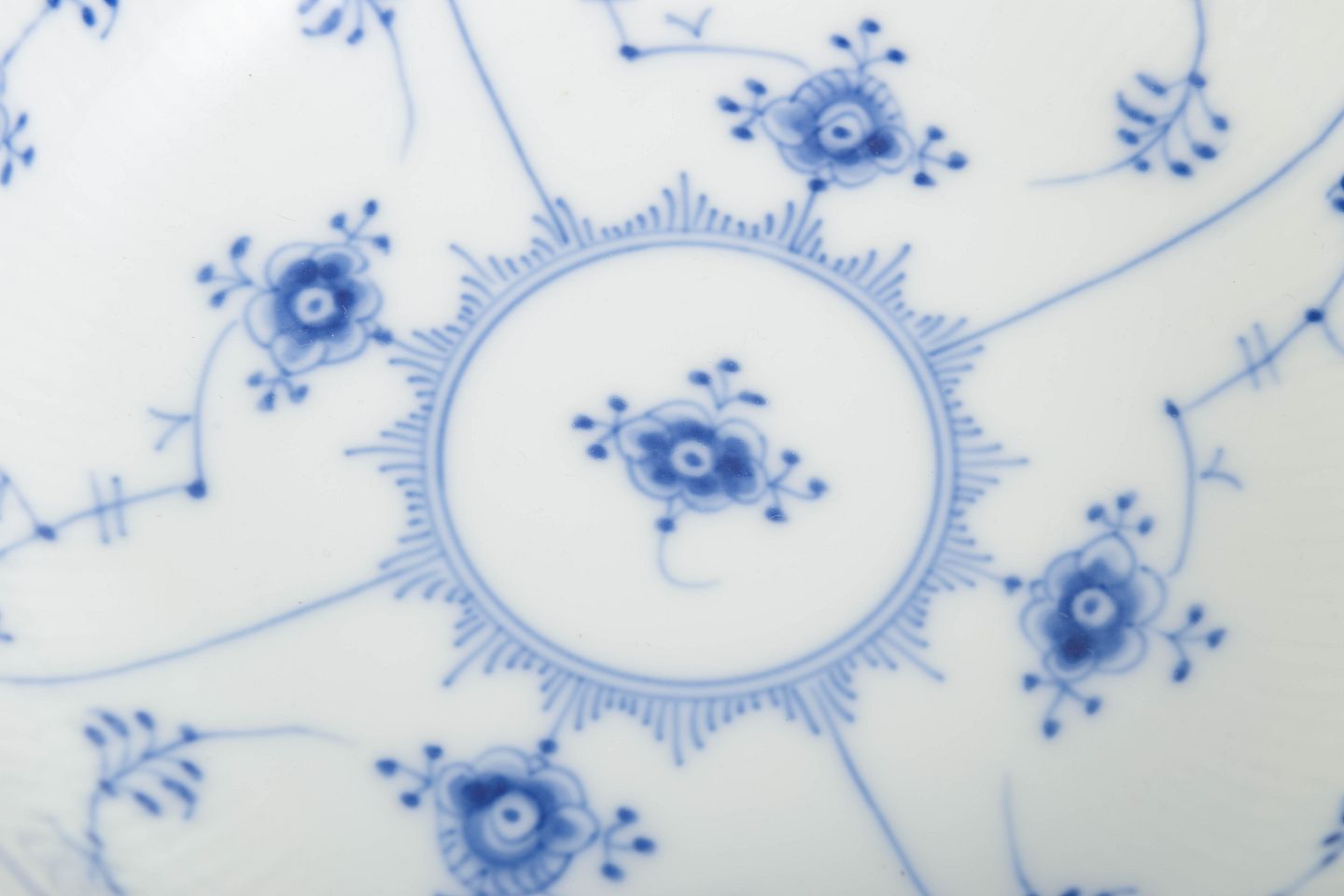 Musselmalet Riflet er Royal Copenhagens ældste og mest traditionsrige stel, introduceret i 1775. Dekorationen er inspireret af kinesisk porcelæn og udføres i frihåndsmalet koboltblåt underglasur, hvilket giver hvert enkelt stykke et individuelt præg. I 1920’erne blev stellet fortsat produceret i klassiske, funktionelle former med stor teknisk præcision og en sikker penselføring, som i dag gør disse genstande eftertragtede blandt samlere.