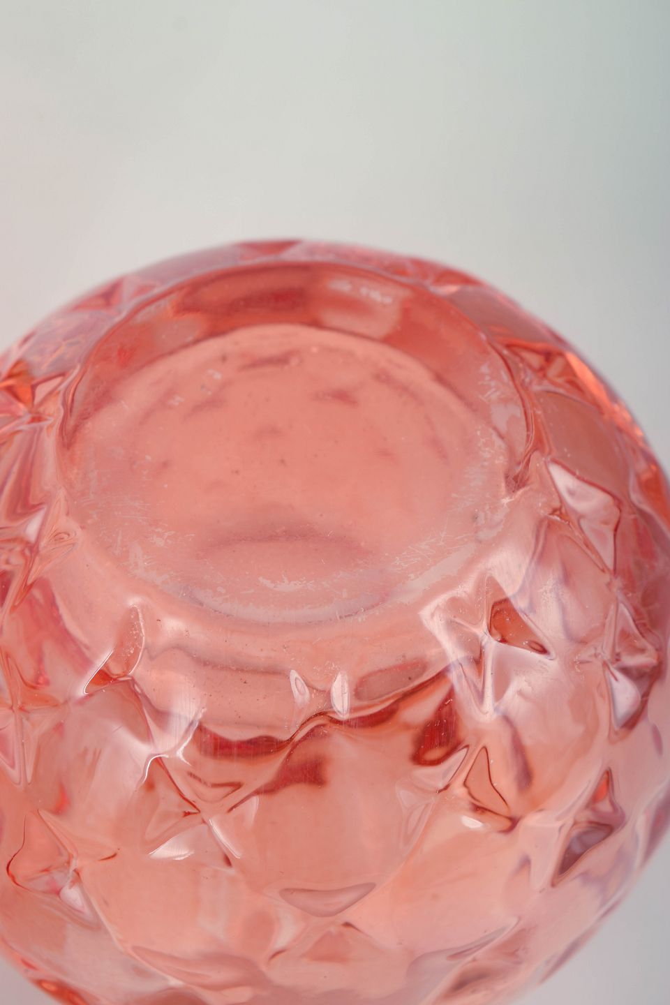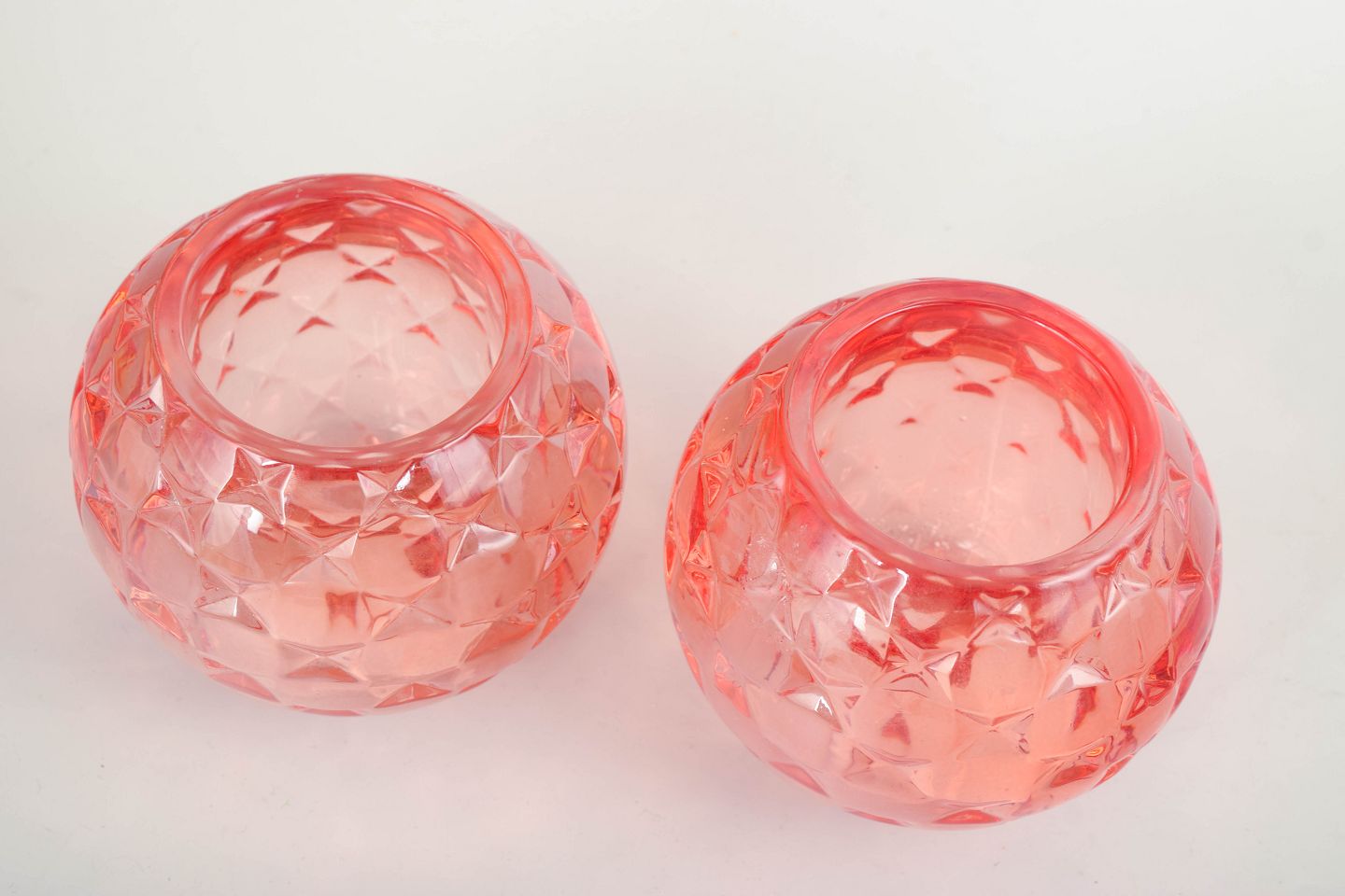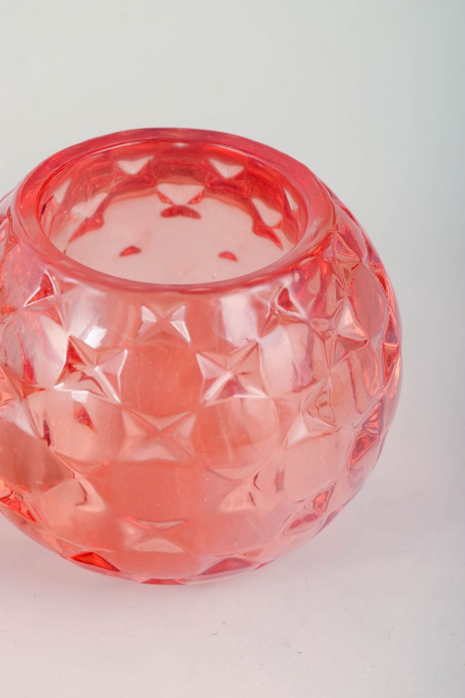 Kjell Engman for Kosta Boda, et par fyrfadsstager.Et par kugleformede fyrfadsstager i presset glas med en facetslebet, geometrisk overflade og transparent rosa farvetone. Den skulpturelle, juvellignende form forstærker lysets spil, når de er tændt, og er karakteristisk for Kjell Engmans ekspressive tilgang til svensk studioglas og kunstglas i slutningen af det 20. århundrede.