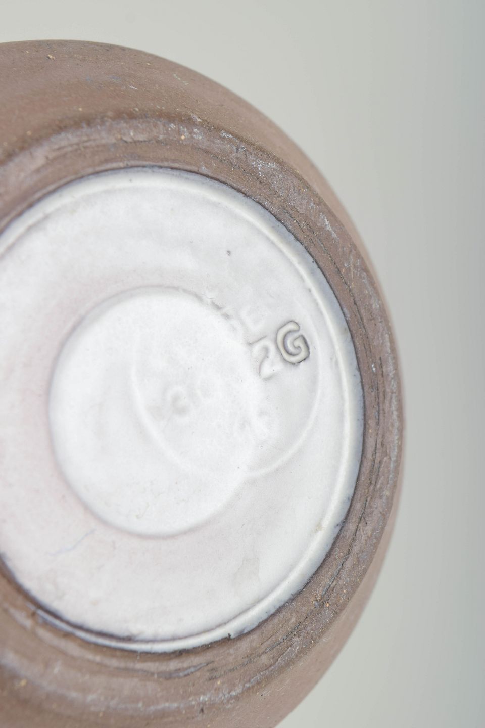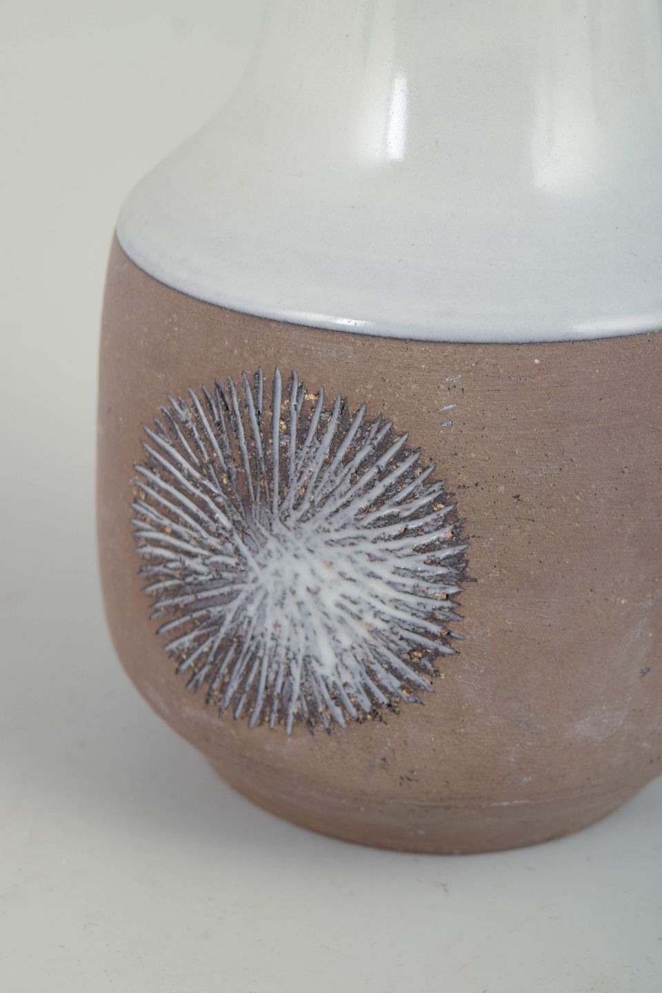 Rundbuget vase i glaseret keramik med kort hals og markant skulder. Underdelen er udført i en varm, brunlig glasur og dekoreret med grafiske, stiliserede blomster- eller strålemotiver i hvid, mens overdelen er afsluttet i blank hvid glasur. Kontrasten mellem de to glasurer giver vasen et klart og balanceret modernistisk udtryk. Modelnummer 3062G.