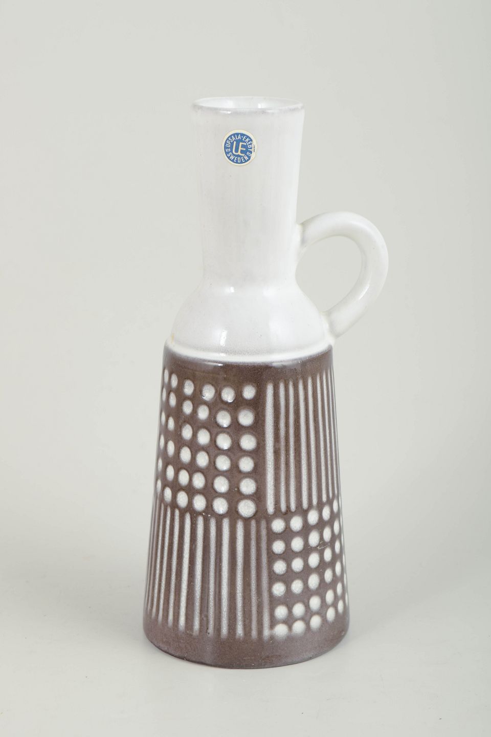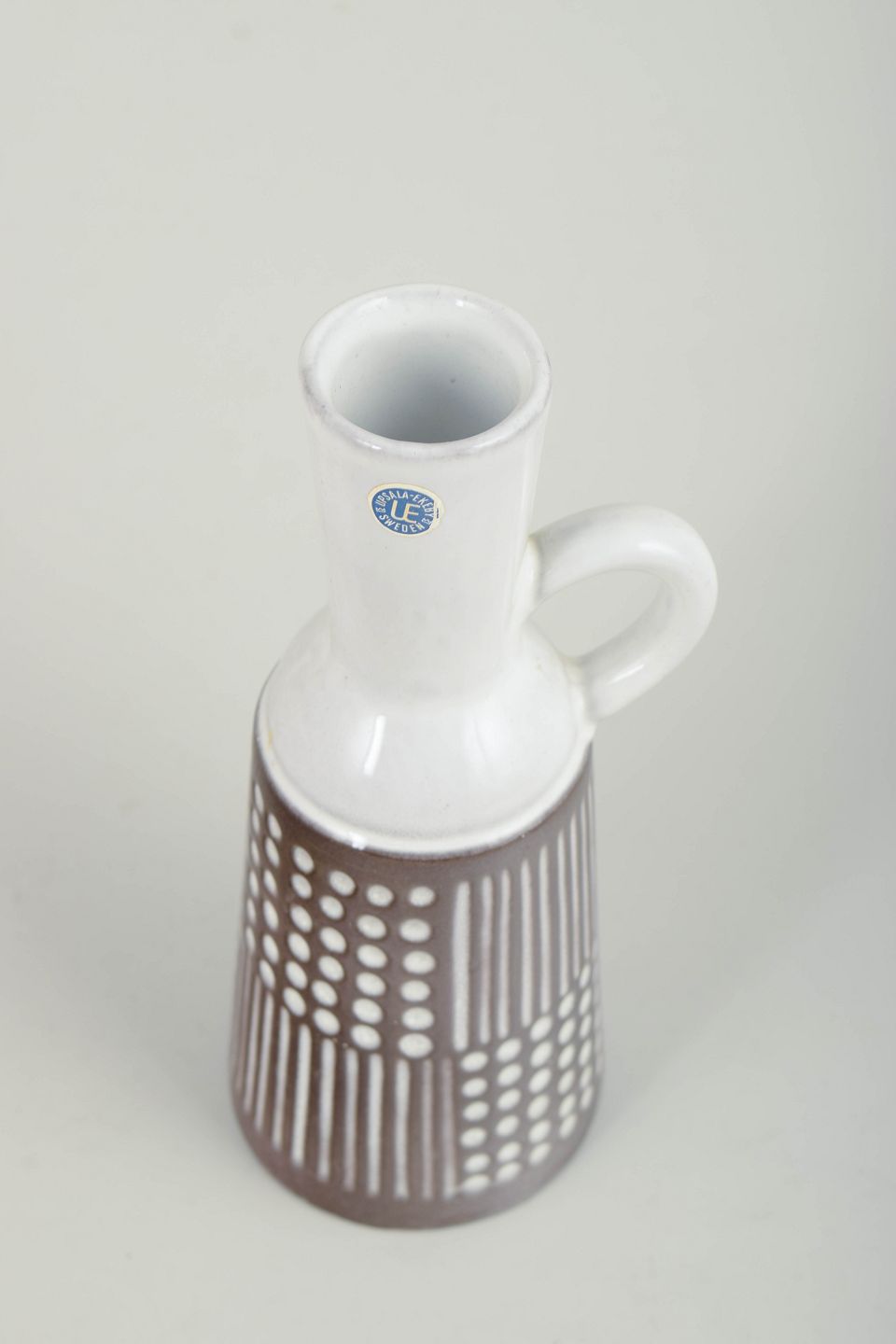Mari Simmulson for Upsala Ekeby, kande.Slank, cylindrisk kande i glaseret keramik med smal hals og enkelt hank. Underdelen er dekoreret med grafiske prik- og stregmønstre i hvid mod brun bundglasur, mens den øvre del er udført i hvid glasur. Dekorationen fremstår stram og rytmisk med et tydeligt modernistisk udtryk. Modelnummer 4563.