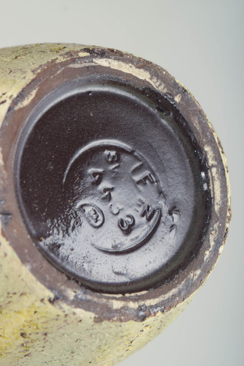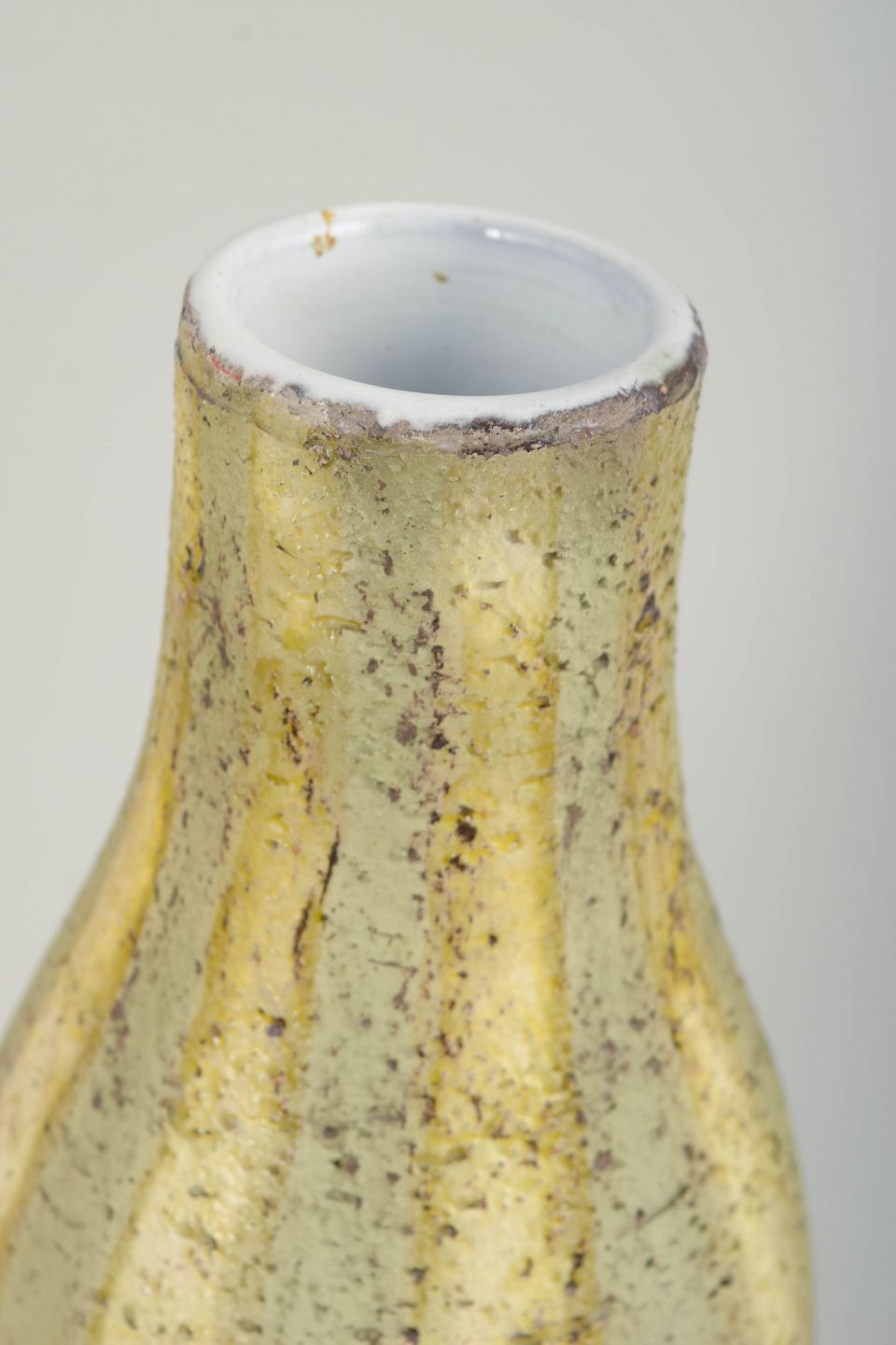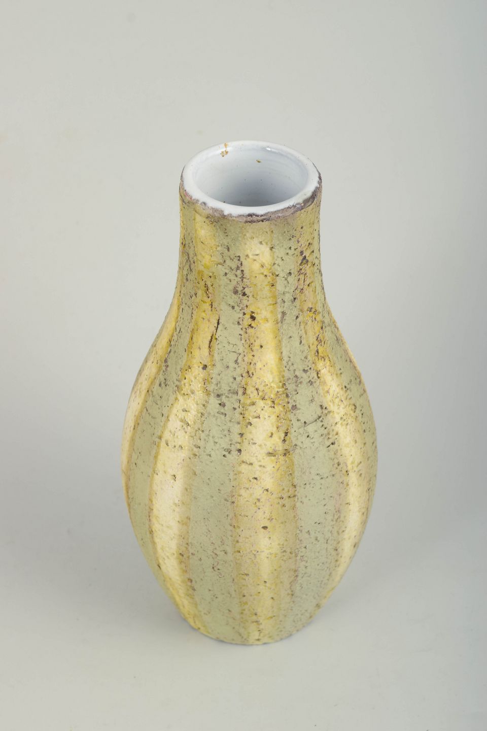 Mari Simmulson for Upsala Ekeby, vase.Organisk formet vase i glaseret keramik med smal hals og blødt buede sider. Dekoreret med lys gul glasur med mørke sprøjt og lodrette nuanceringer, der giver et levende, tekstureret udtryk. Modelnummer 4433.