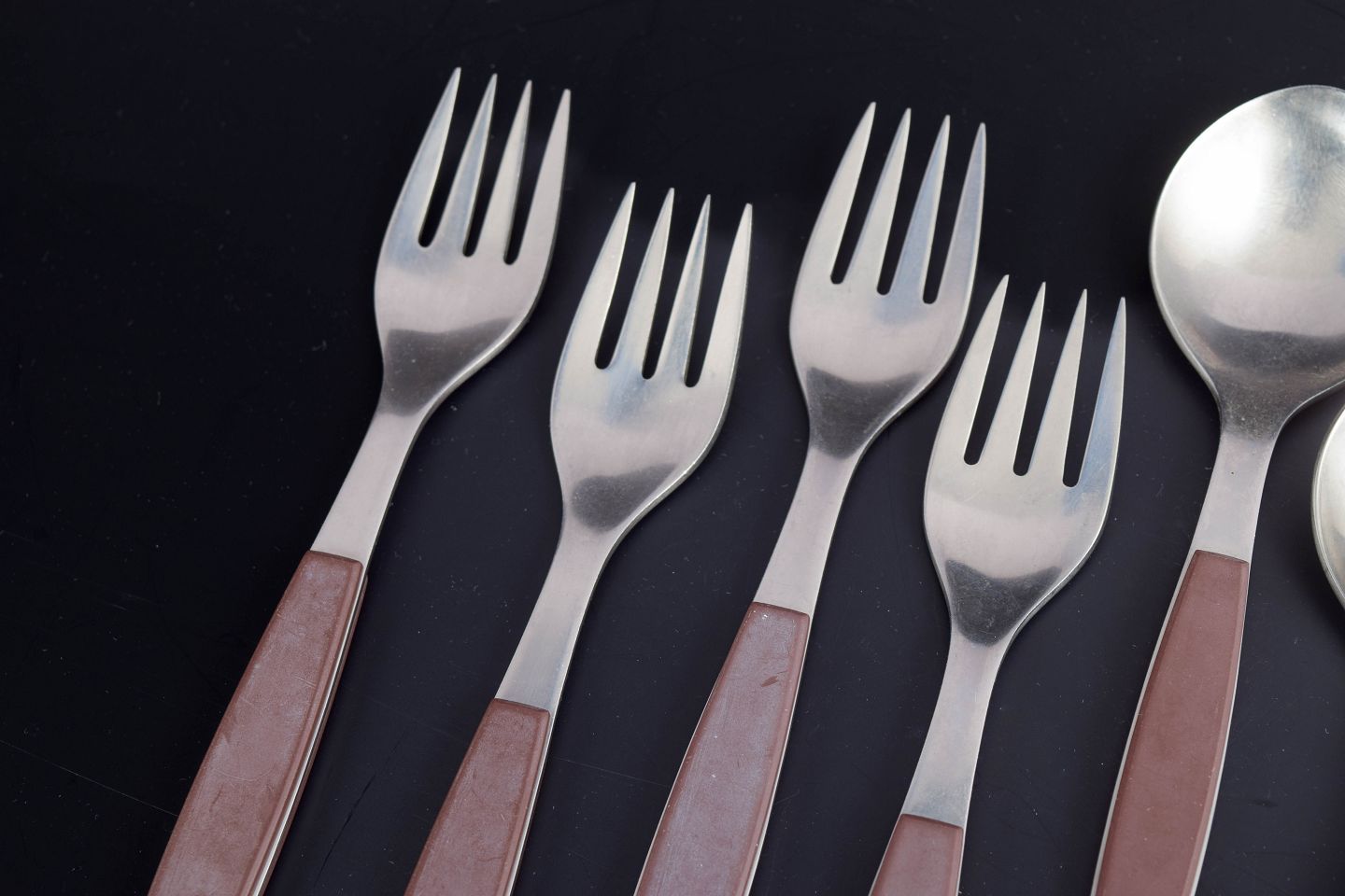 Henning Koppel for Georg Jensen, bestiksæt til 4 personer.Sæt bestående af fire middagsknive, fire middagsgafler og fire spiseskeer i rustfrit stål med brune håndtag. Modellen er fra Strata-serien.