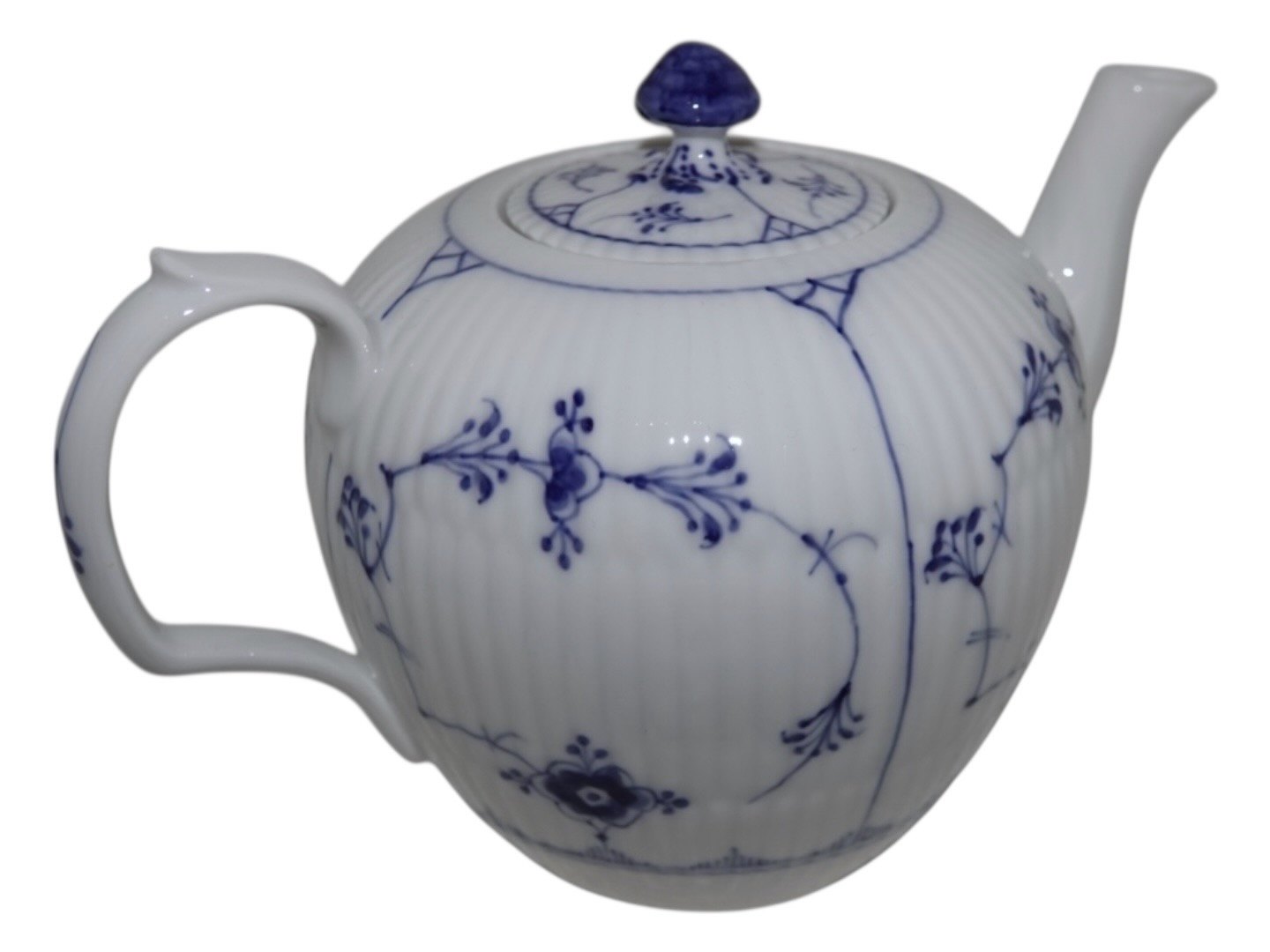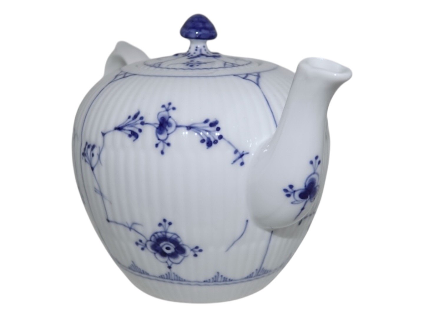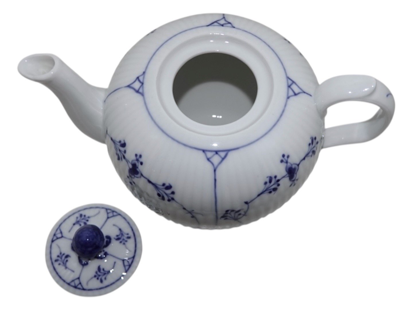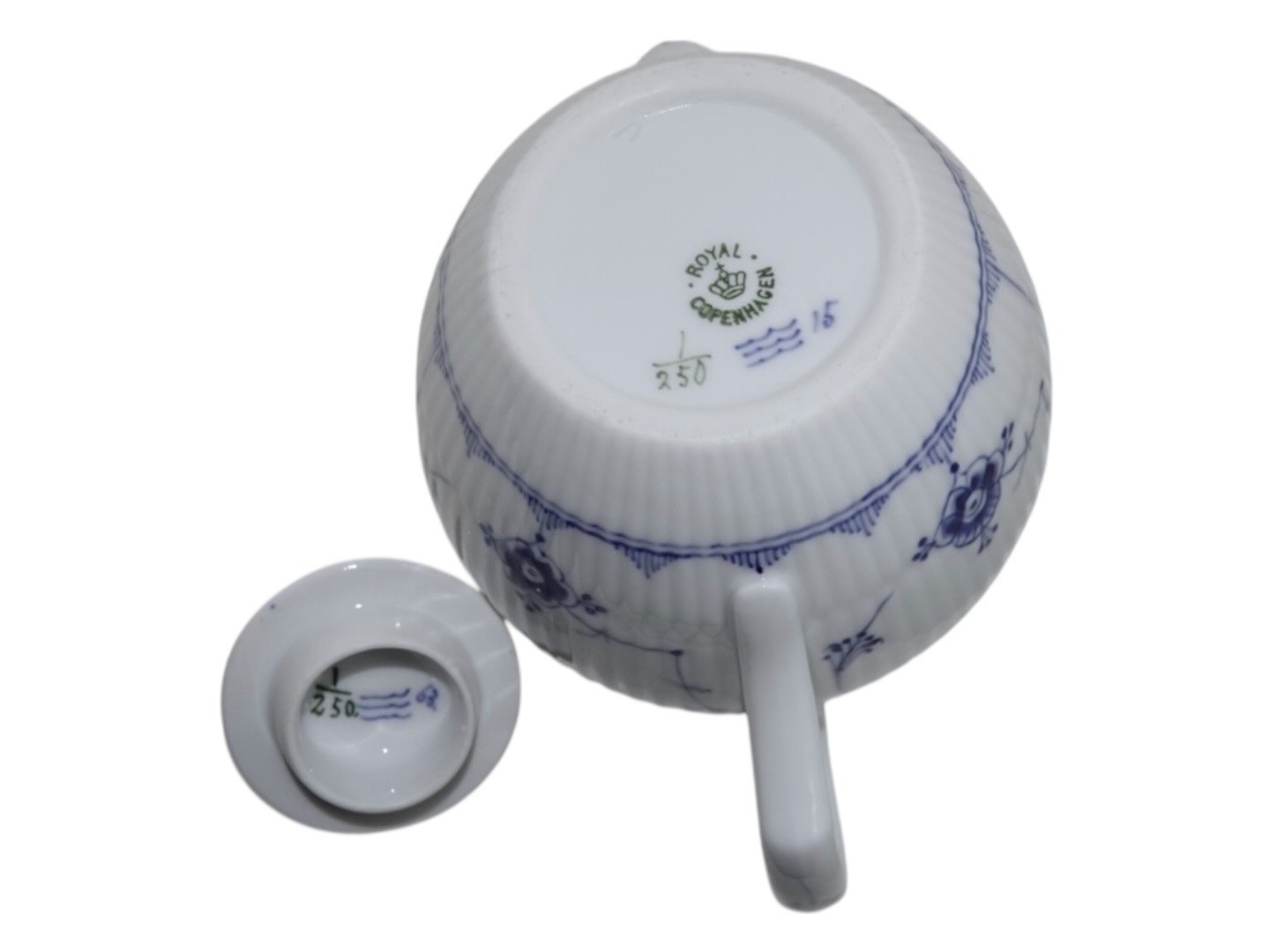 Royal Copenhagen Musselmalet Riflet, lille og sjælden tekande.Af fabriksmærket ses det, at denne er produceret mellem 1898 og 1923.