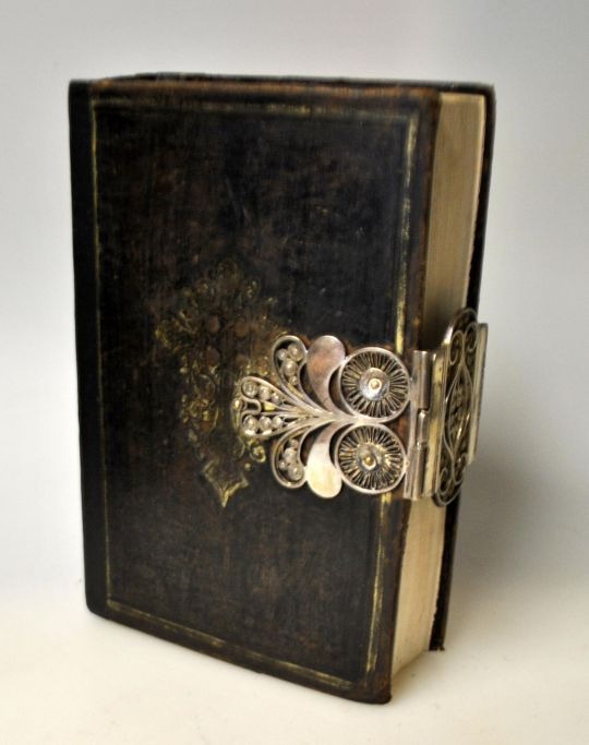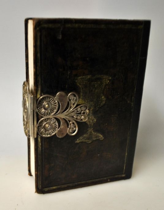 Salme bog i sort læderindbinding og sølv beslag, 1857. Danmark. Sølvbeslag med filigram. H.: 17 cm. Sølvbeslag med utydeligt mestermærke.Indvendig med tekst: Tilhører Christian Pallesen kiøbt paa Aftægt den 29. Januari 1857.