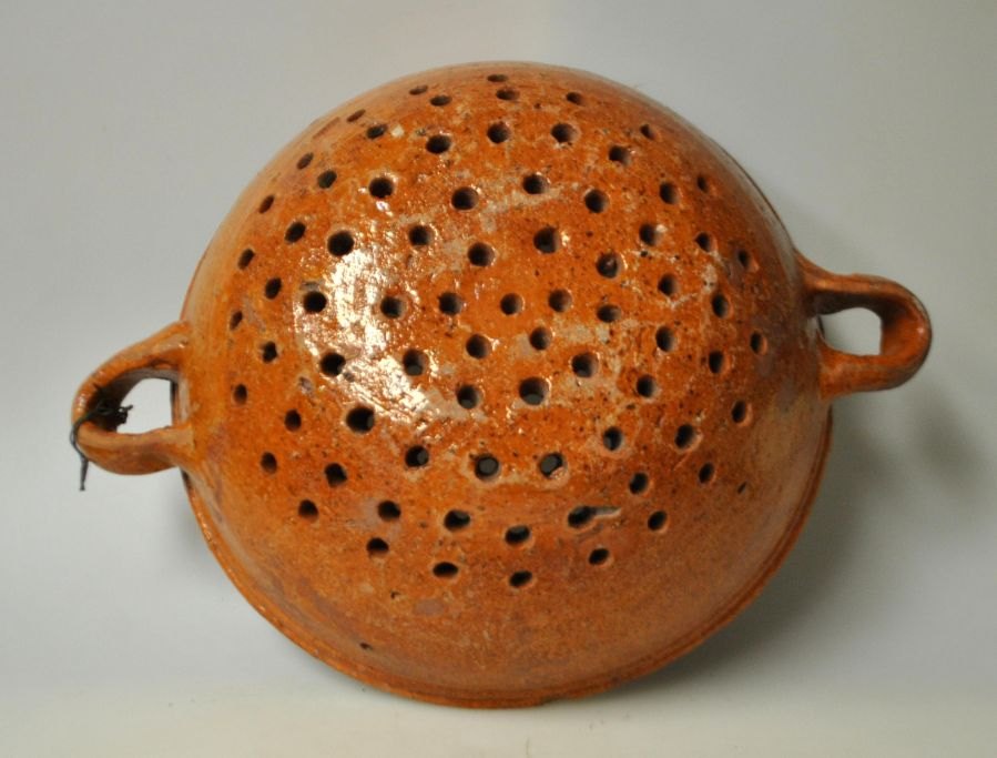 Dørslag i glaseret lertøj, 19. årh. Danmark. Rødbrun glasur. Dia: 24 cm.Emne nummer: 28819