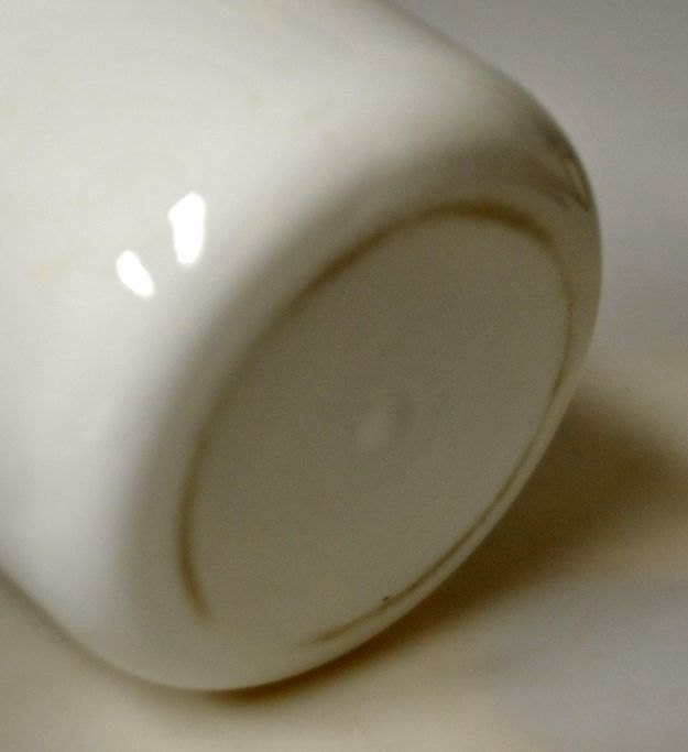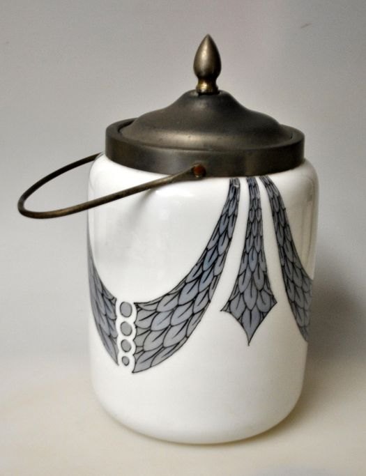 Bisquitdåse, Fyns Glasværk, opalhvid glas med påbrændt dekoration, 1910. Nr. 2287/429. Dekoration med kontur som overføringsbillede. Med metalbeslag i forsølvet nikkel med hank og låg. H. inkl. låg: 21 cm. Dia: 12,5 cm.NB: Findes i Fyns Katalog fra 1910.