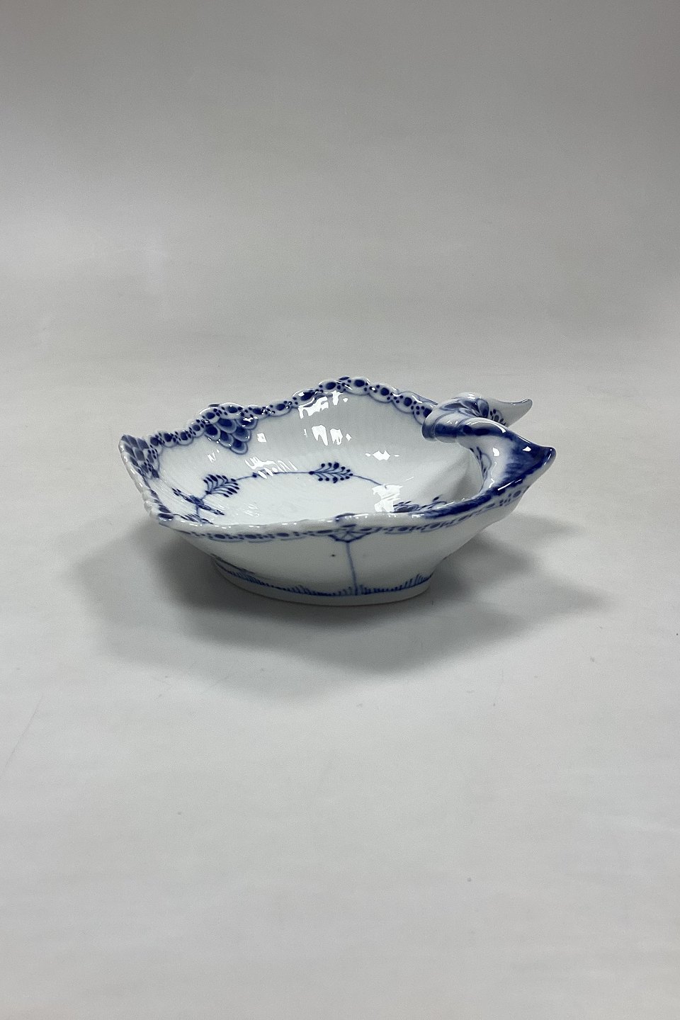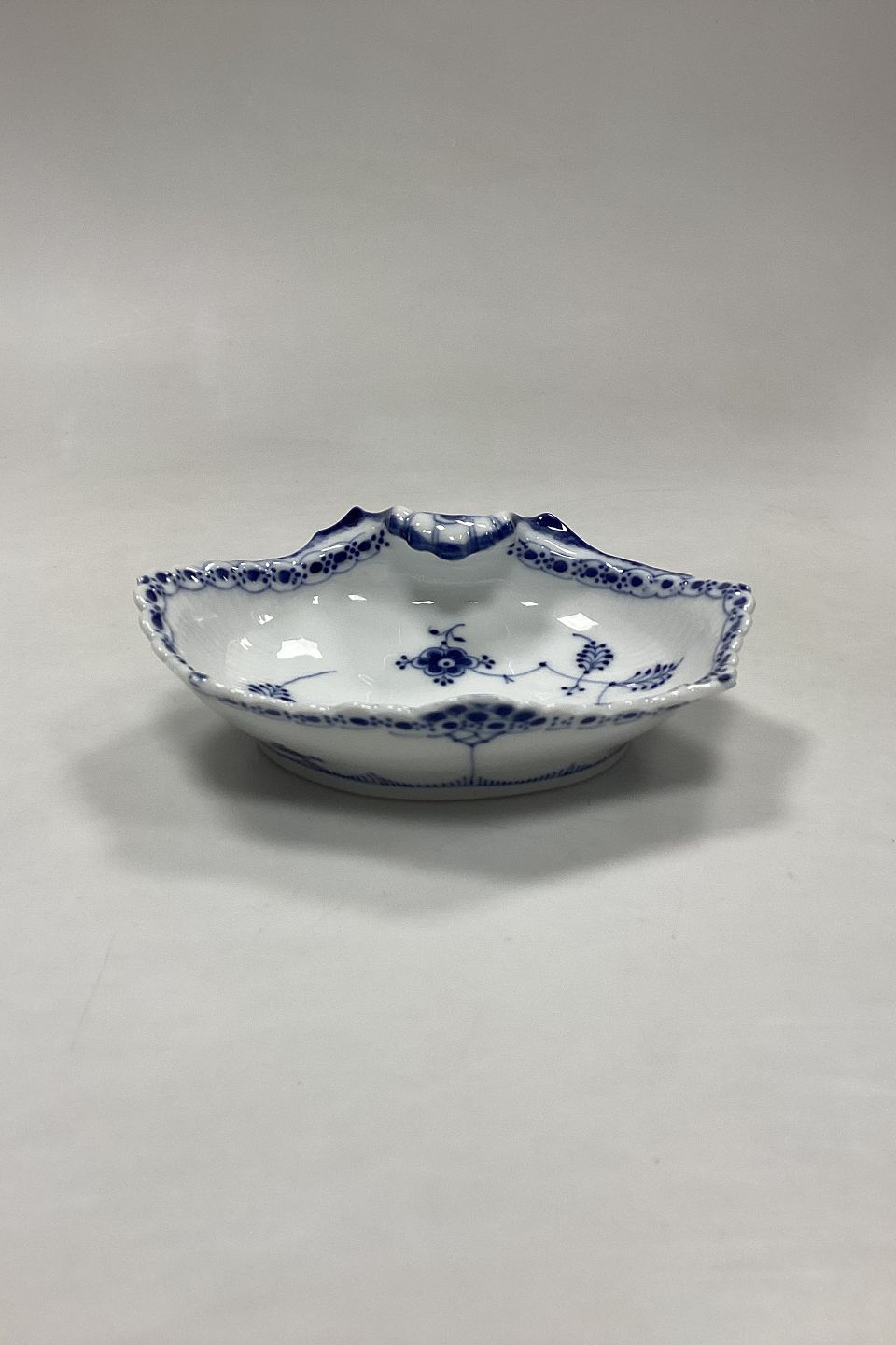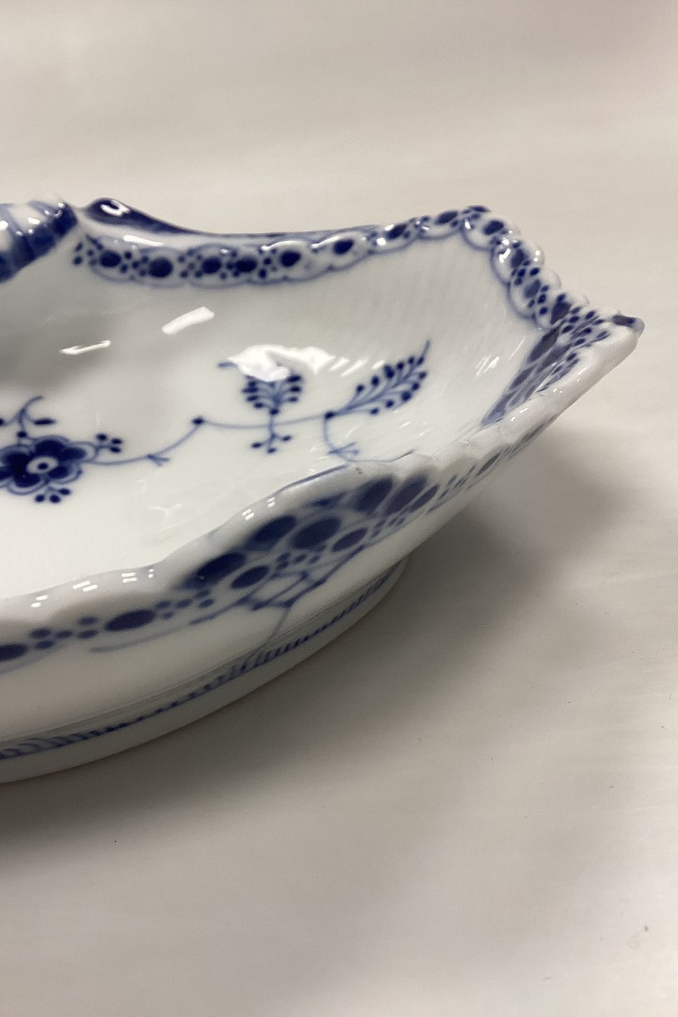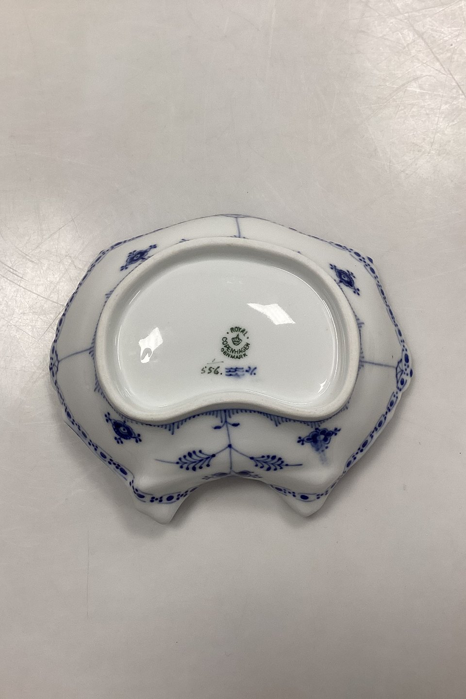 Royal Copenhagen Musselmalet Halvblonde Muslingeskål No. 556. Afslibning på forreste tak, se foto.Måler 19 cm / 7.48 in. 2. Sortering