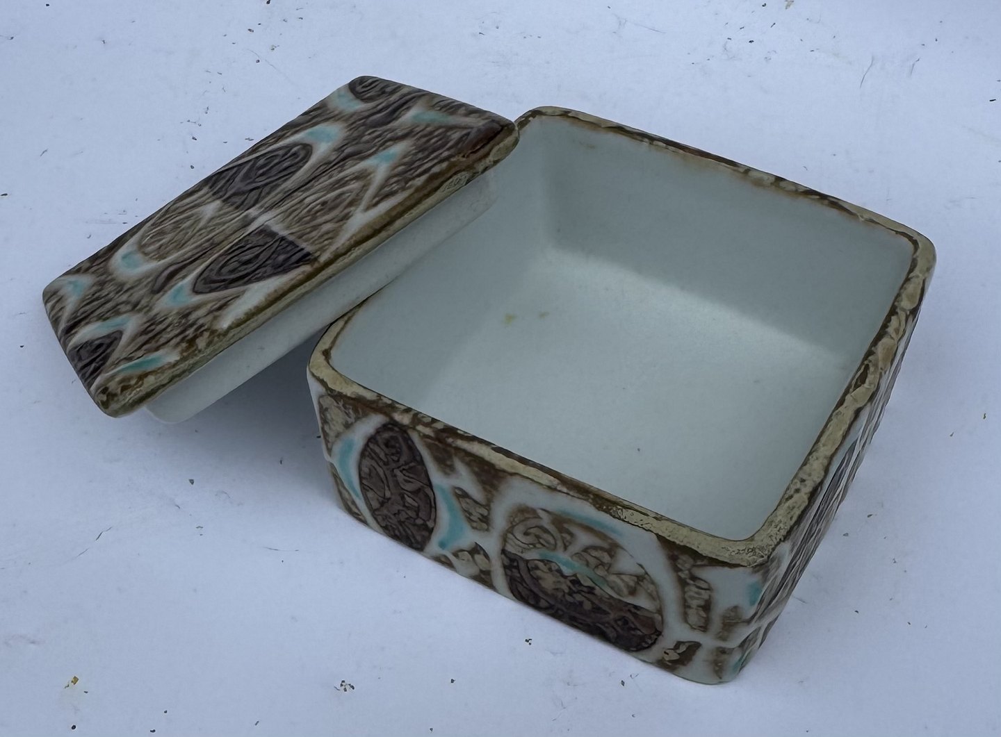 Nils Thorsson: Kvadratisk lågskål i fajance fra Royal Copenhagen designet af den svenske designer. Fremstår i perfekt stand. Mål: H. 4,2 cm samt 7,8 x 7,8 cm