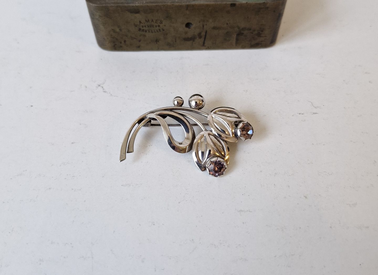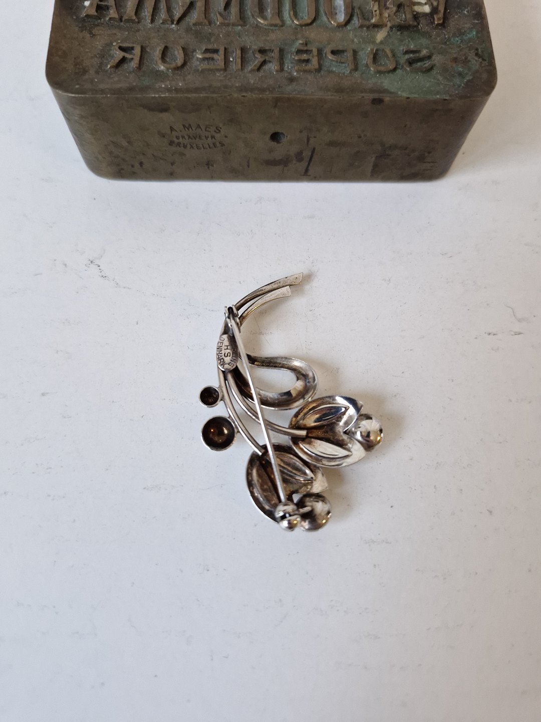 Vintage sølv broche i form af blade og blomster med lilla sten af Hermann SiersbølStemplet: HS - Sterling - Denmark