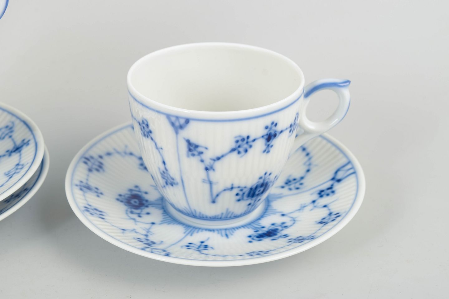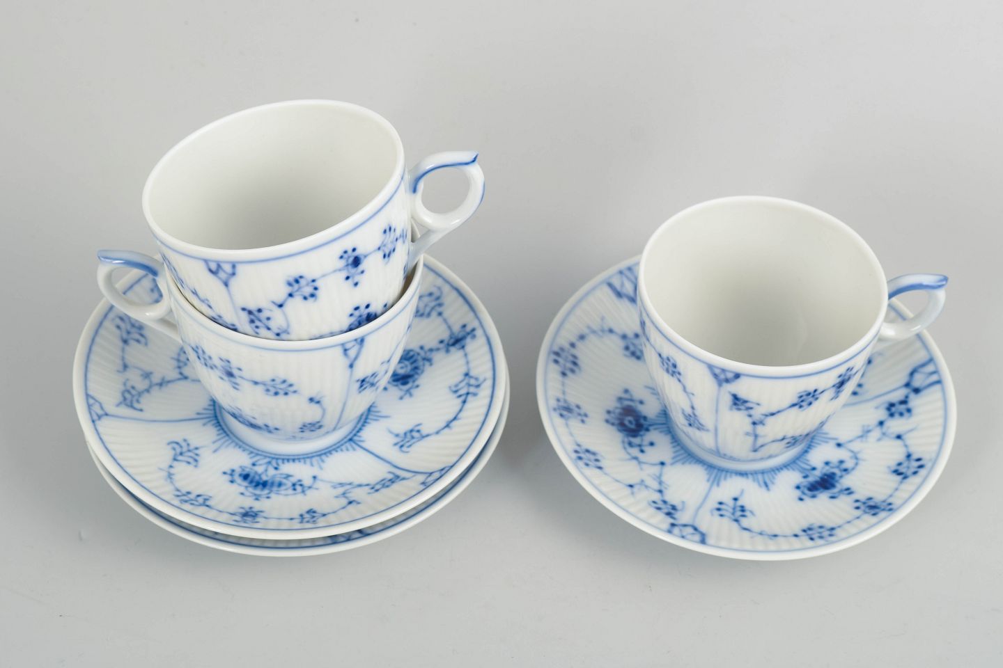Royal Copenhagen, Musselmalet Riflet, kaffestel til 3 personer.Kaffestel i porcelæn fra serien Musselmalet Riflet, bestående af kopper og underkopper til tre personer, model 1/2162. Klassisk riflet form med håndmalet blå dekoration.