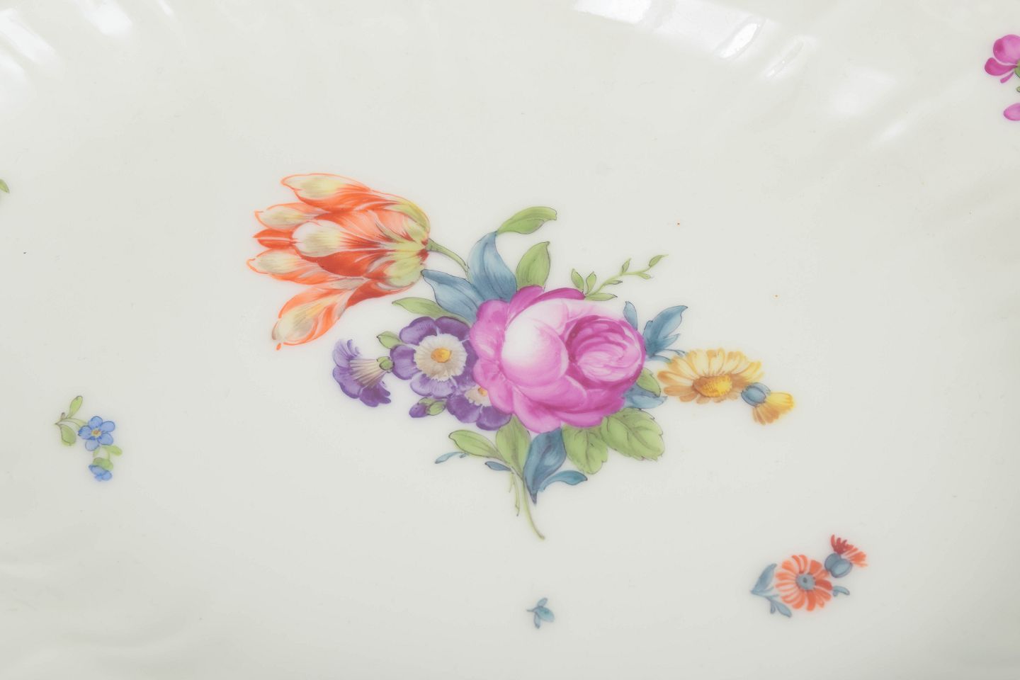 Stort ovalt serveringsfad i hvidglaseret porcelæn med håndmalet blomsterdekoration i serien Saksisk Blomst og forgyldt kant; model 4/1555.