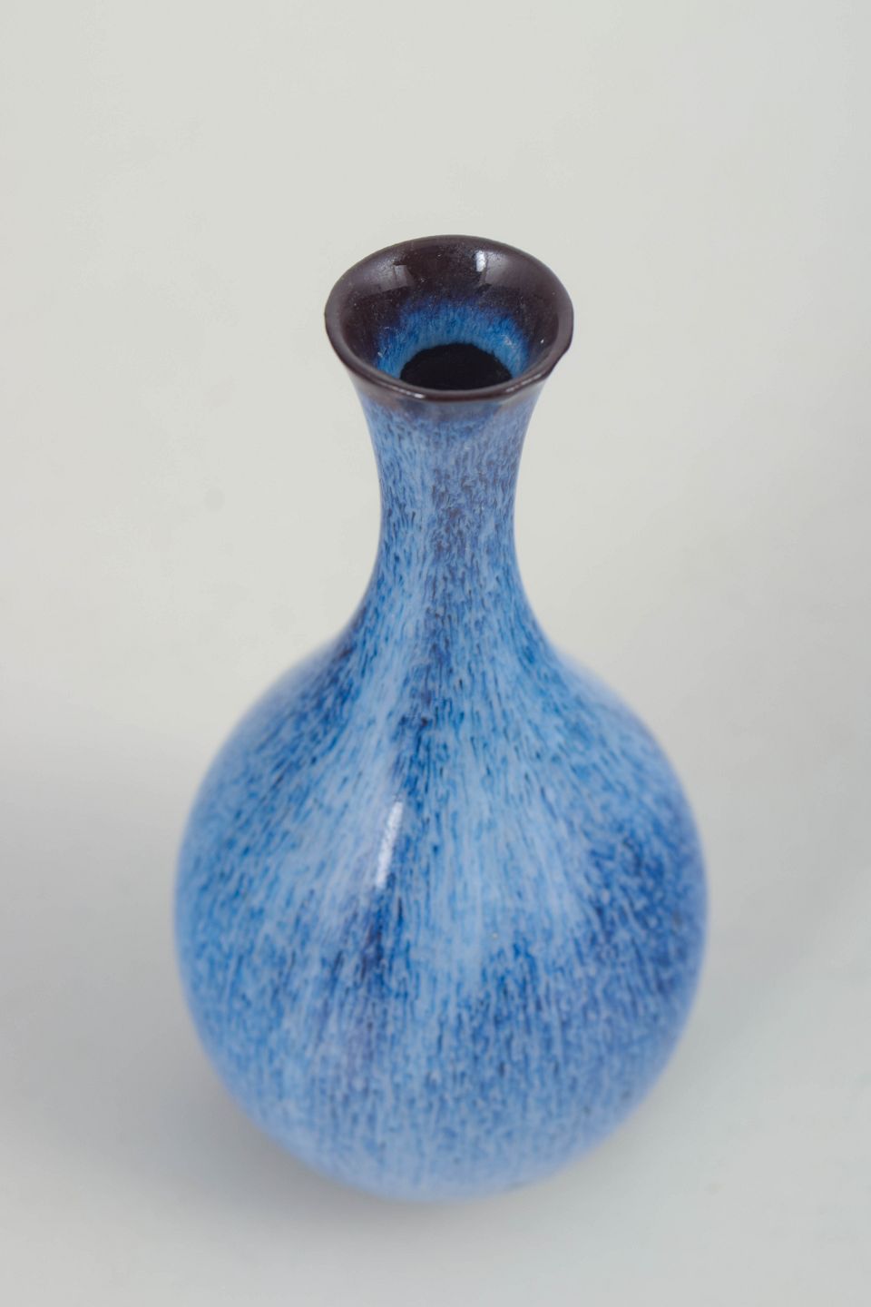 Gunnar Nylund for Rörstrand, miniature vase.Elegant balusterformet vase i glaseret stentøj med smal hals og afrundet bug. Overfladen er dækket af en levende blå glasur med fine lodrette spil og let mørkere rand ved mundingen. Modellen fremstår i første sortering og viser den sikre balance mellem form og glasur, der kendetegner Gunnar Nylunds arbejde for Rörstrand.