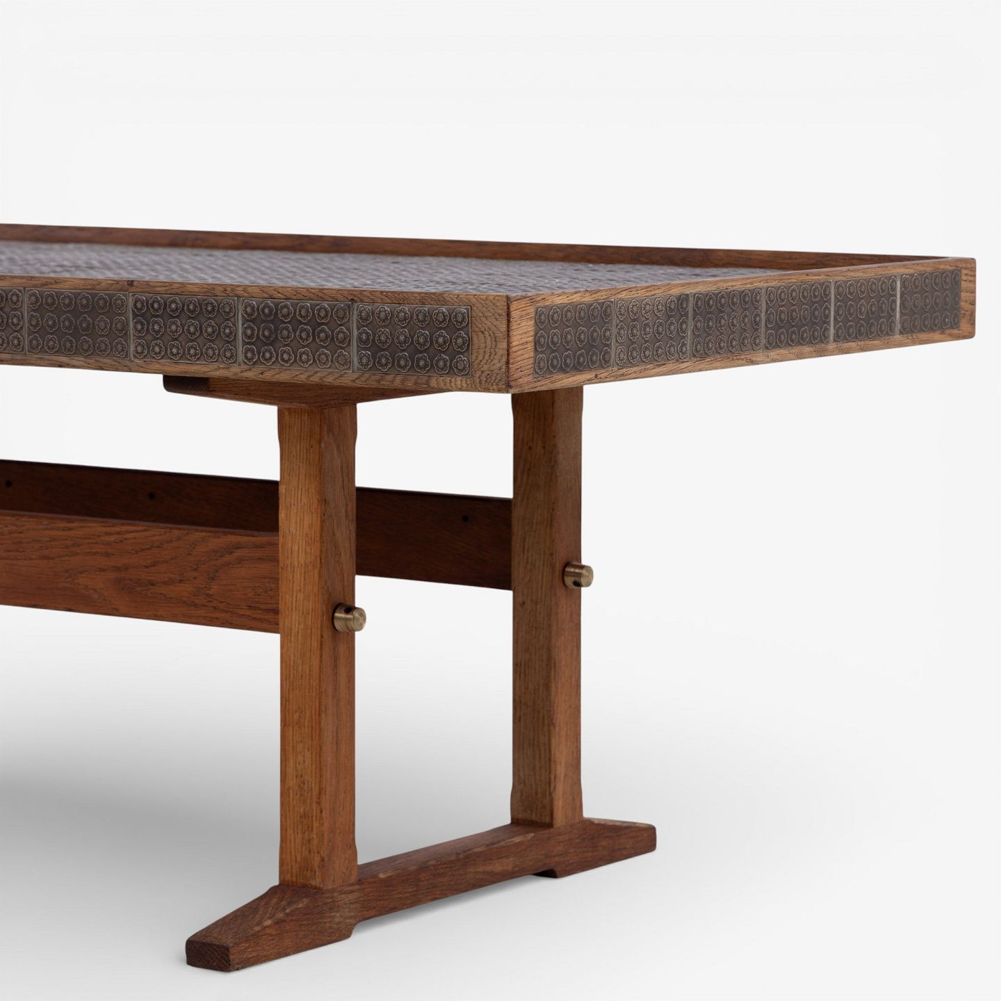 Sofabord i patineret egetræ dekoreret med brune kakler. Stemplet fra producent.