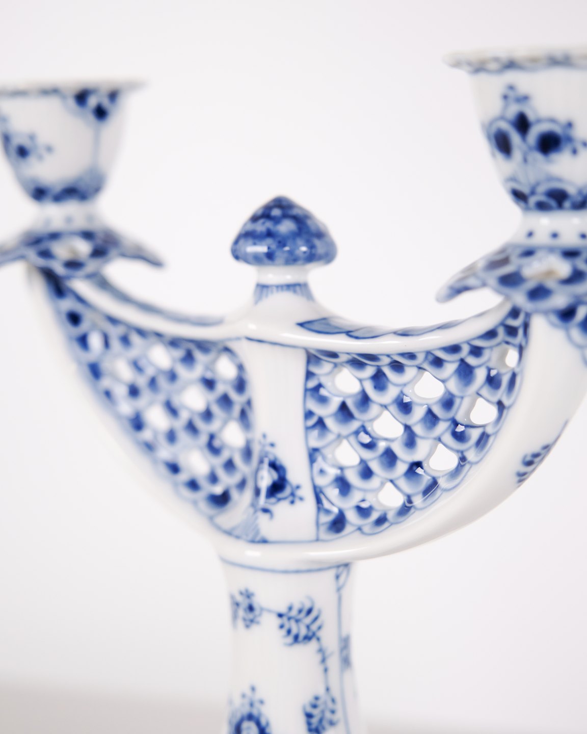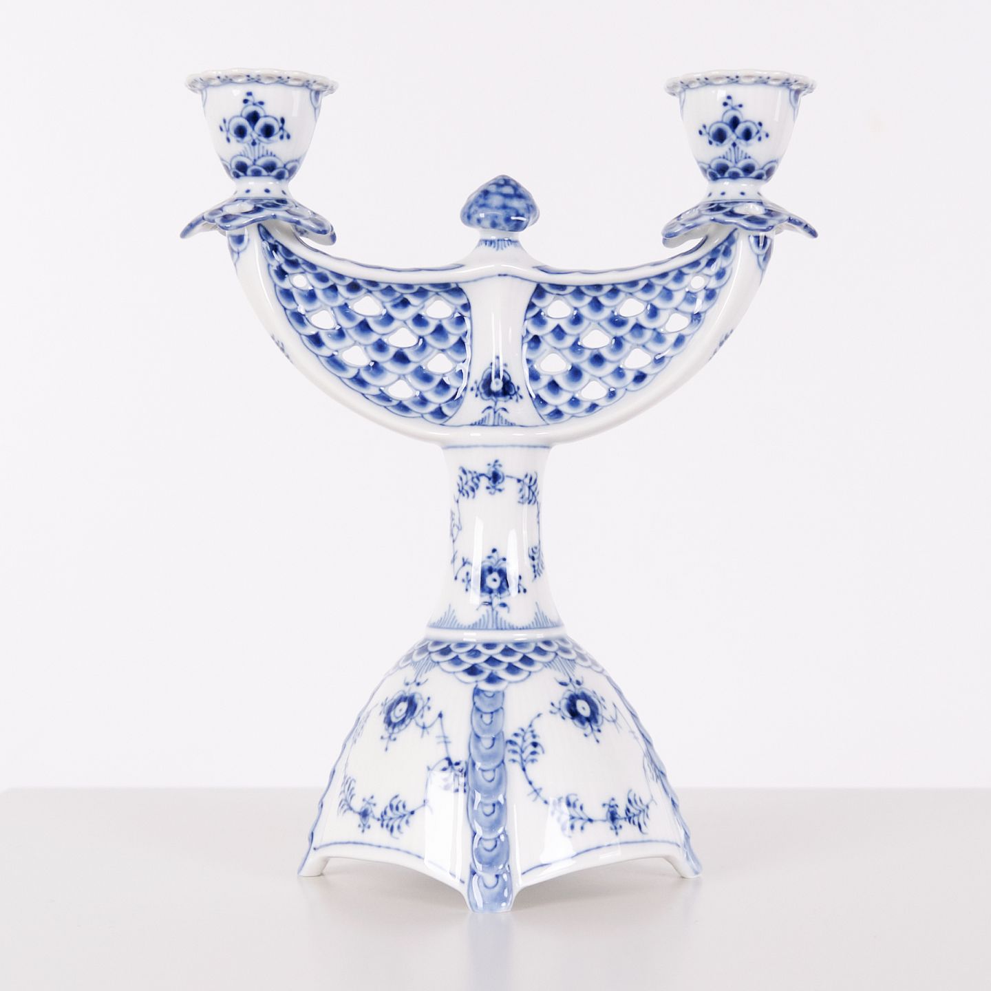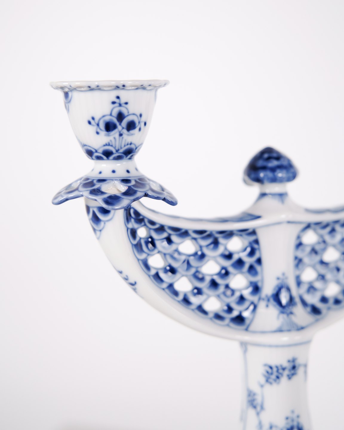 To-armet lysestage i musselmalet helblonde porcelæn, model 1169, produceret af Royal Copenhagen. Lysestagen er udført i håndmalet porcelæn med det klassiske helblonde-mønster, kendetegnet ved gennemgående gennembrudt bort og detaljeret underglasurdekoration. Modellen er produceret som 1. sortering og indgår i Royal Copenhagens traditionelle servicenproduktion.— Producent: Royal Copenhagen