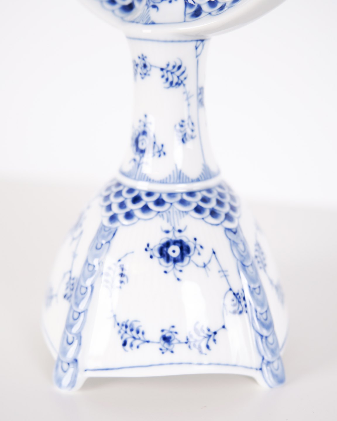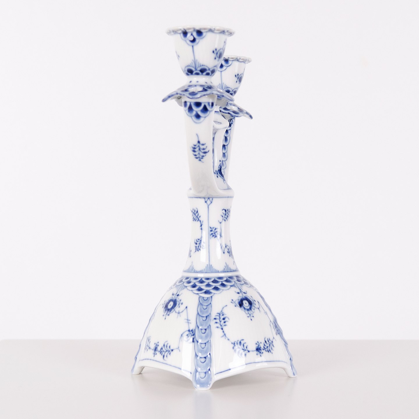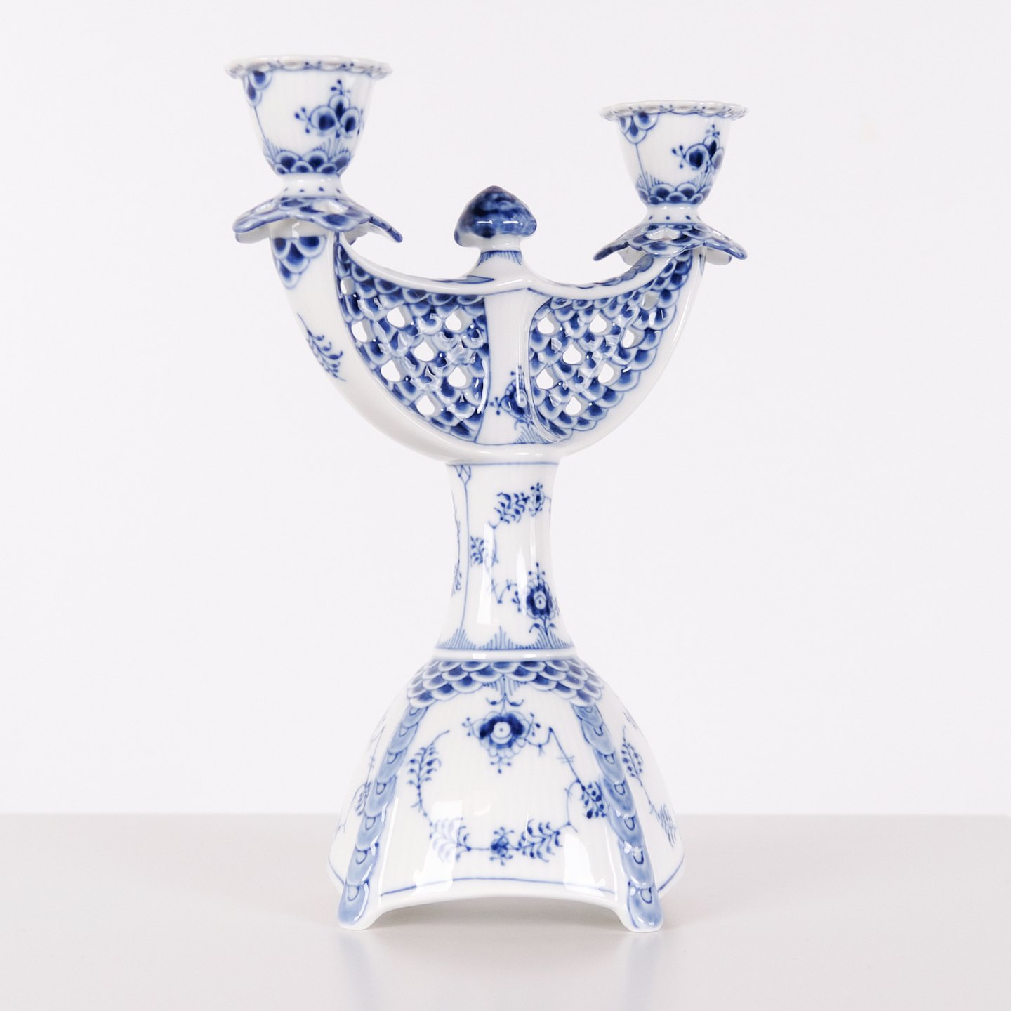 To-armet lysestage i musselmalet helblonde porcelæn, model 1169, produceret af Royal Copenhagen. Lysestagen er udført i håndmalet porcelæn med det klassiske helblonde-mønster, kendetegnet ved gennemgående gennembrudt bort og detaljeret underglasurdekoration. Modellen er produceret som 1. sortering og indgår i Royal Copenhagens traditionelle servicenproduktion.— Producent: Royal Copenhagen