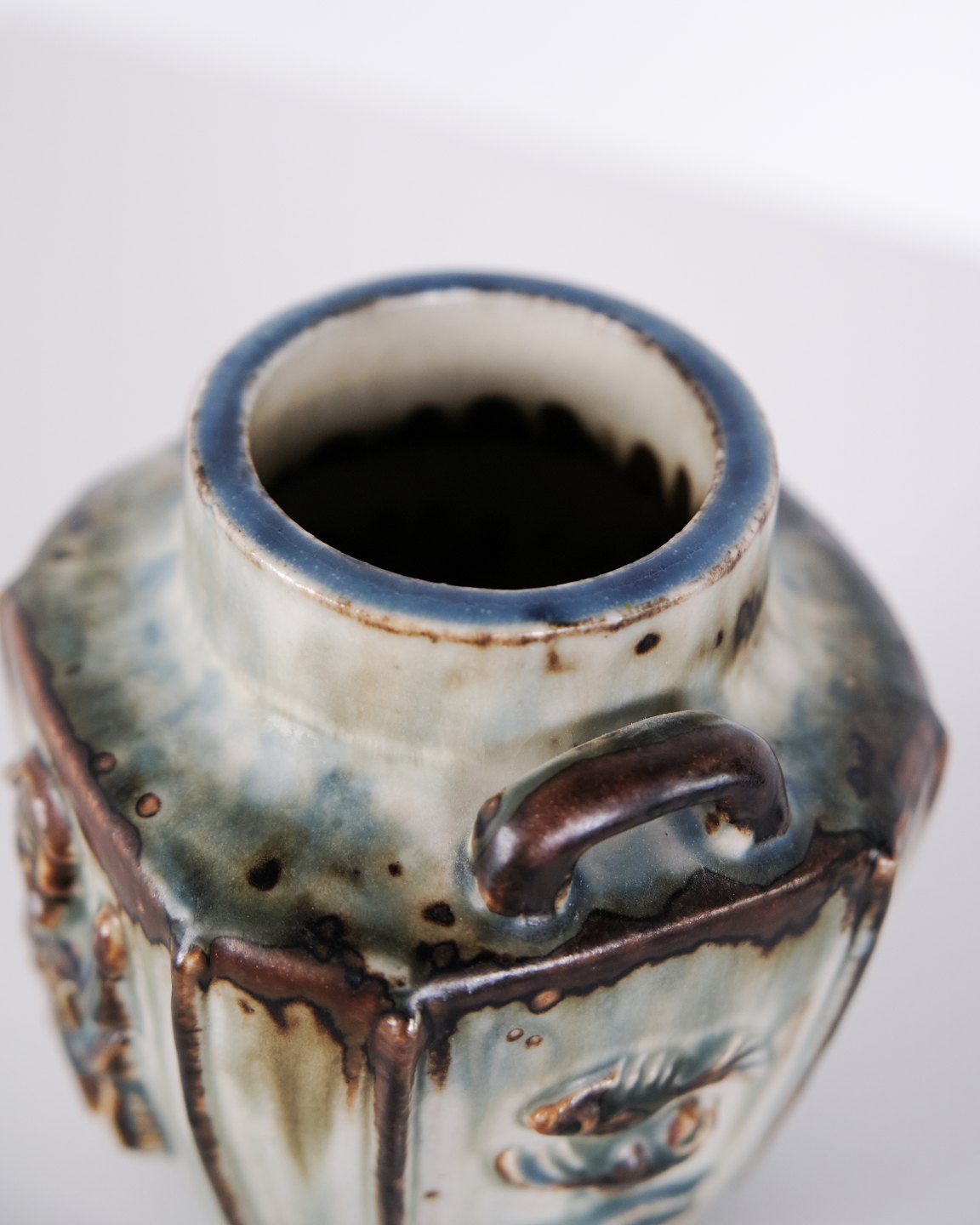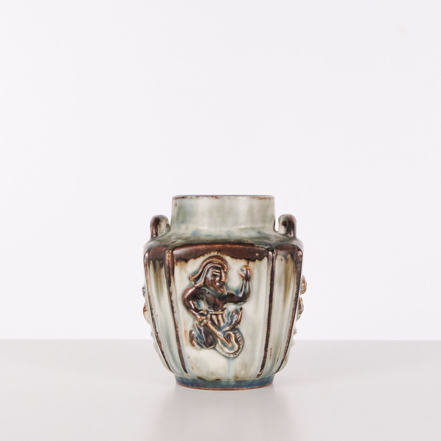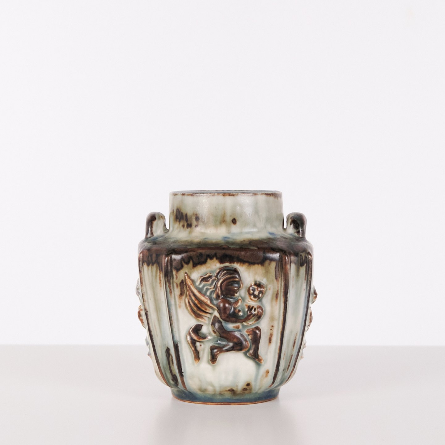 Stentøjsvase designet af Bode Willumsen for Royal Copenhagen. Vasen er modelleret i stentøj med reliefdekoration og produceret hos Royal Copenhagen i perioden 1969–1973. Modellen er kendt for sin plastiske overfladebehandling og tydelige håndværksmæssige udformning. Stemplet og signeret med monogram samt modelnummer 20121.— Designer: Bode Willumsen