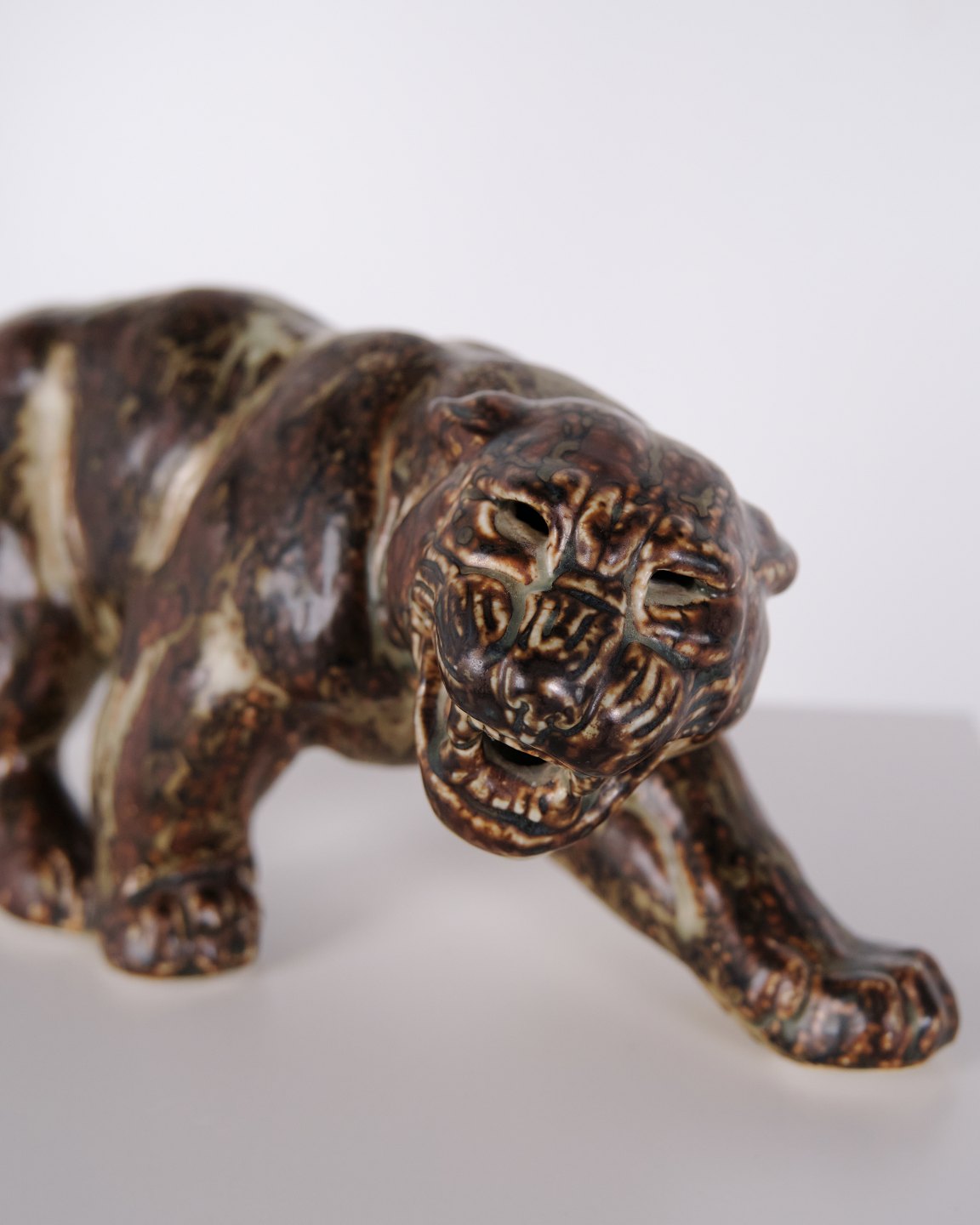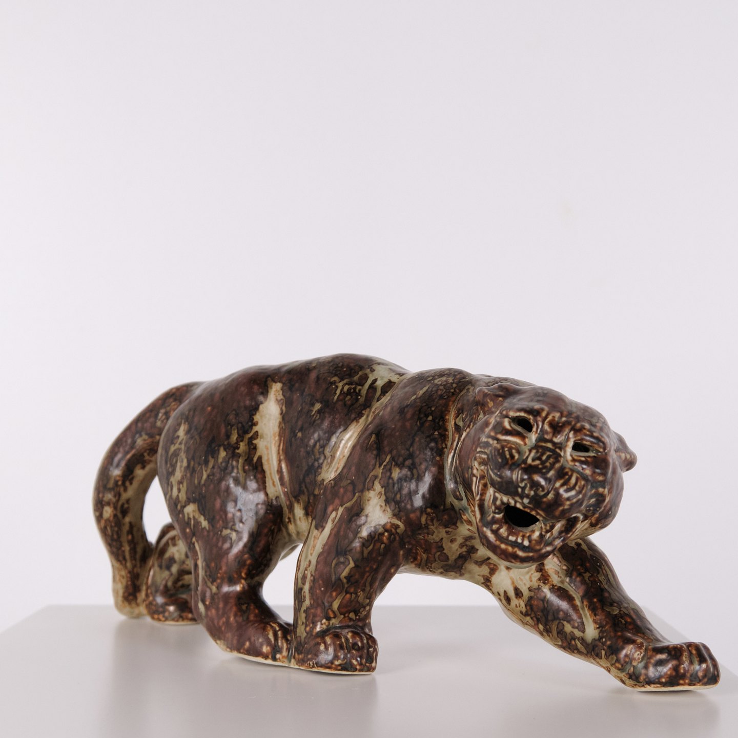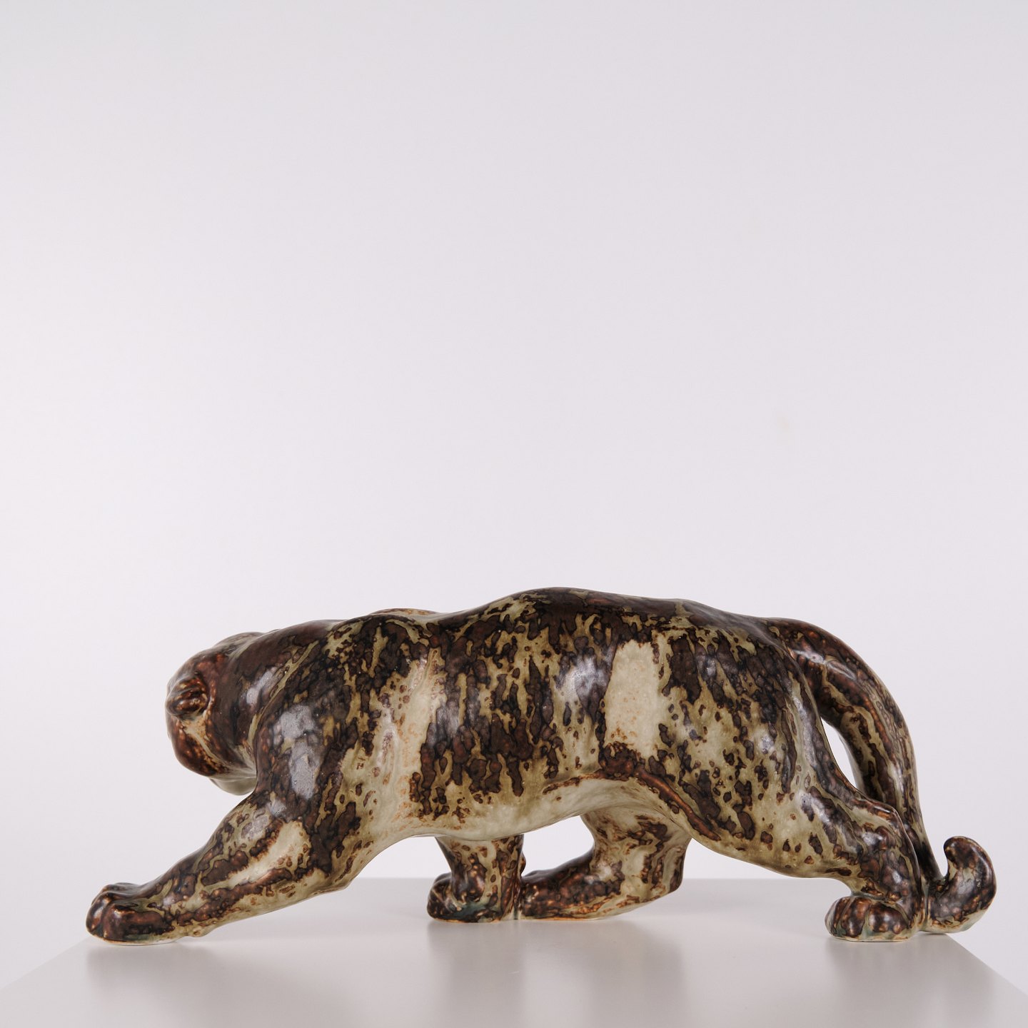 Stentøjsfigur med motiv af panter, model 20283, designet af Knud Kyhn for Royal Copenhagen. Figuren er udført i stentøj og er et karakteristisk eksempel på Knud Kyhns arbejde med dyrefigurer, hvor fokus ligger på kropsform, bevægelse og materialets overflade. Modellen er produceret hos Royal Copenhagen og er efterspurgt inden for dansk keramik fra midten af det 20. århundrede.— Designer: Knud Kyhn