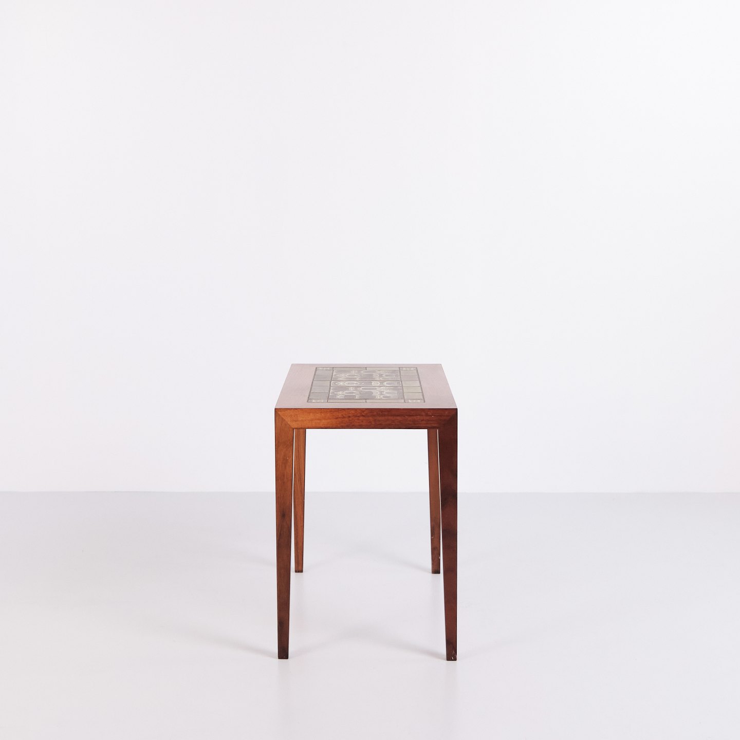 Sidebord, model 163, designet af Severin Hansen og produceret hos Haslev Møbelsnedkeri. Bordet er udført i træ og forsynet med indlagte grønne fajancekakler designet af Nils Thorsson for Royal Copenhagen. Kombinationen af møbelsnedkerarbejde og keramiske kakler er karakteristisk for samarbejder fra 1960’erne og repræsenterer klassisk dansk møbeldesign fra perioden.