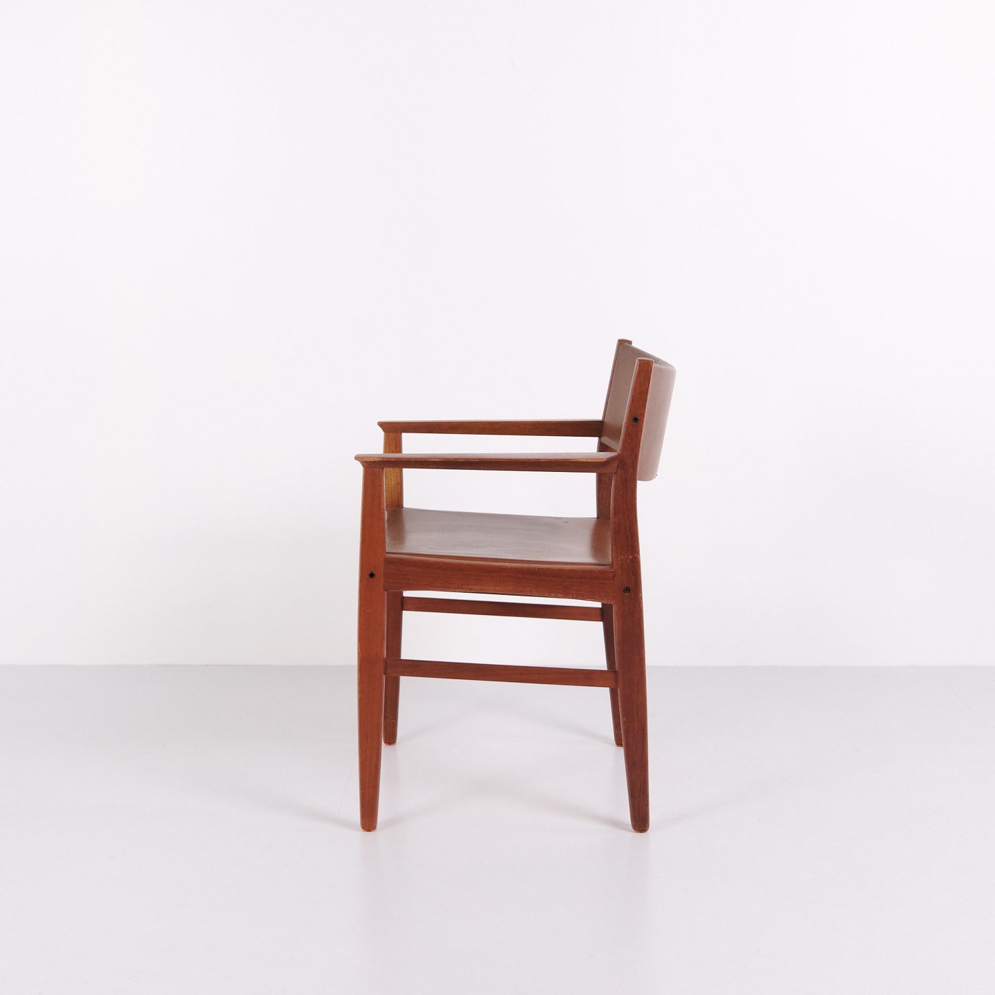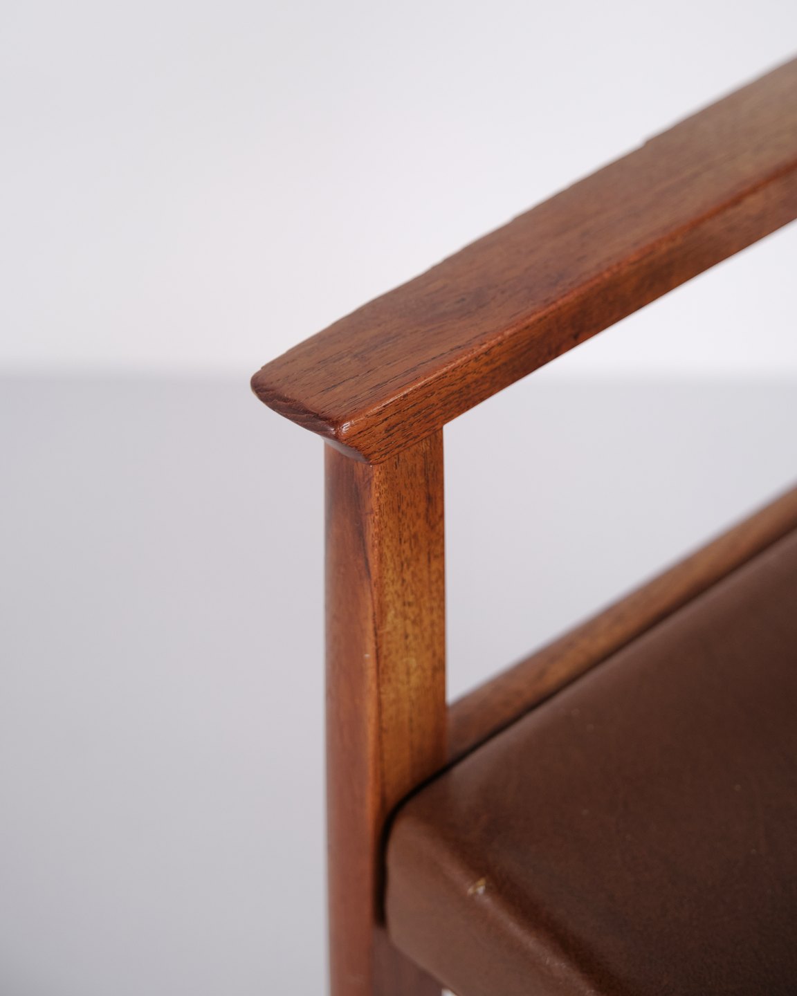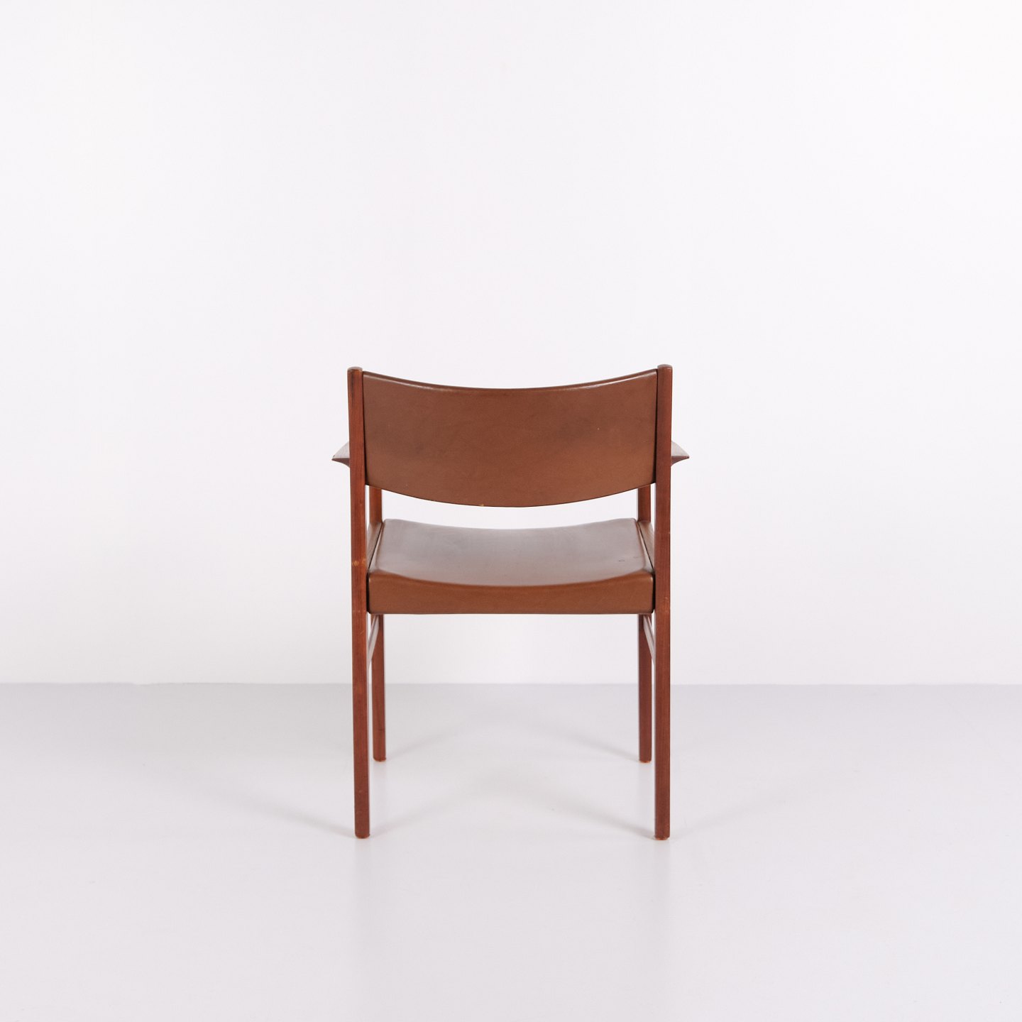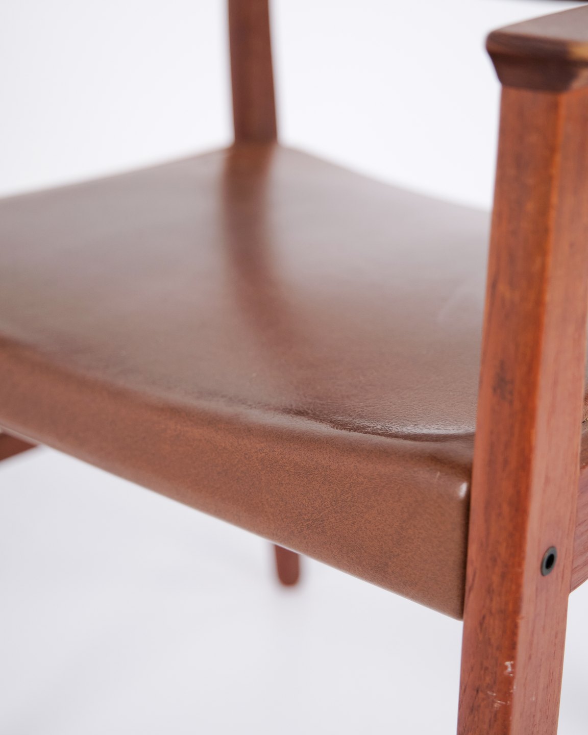 Armstol udført i teaktræ med sæde og ryg betrukket med brunt læder. Stolen er et typisk eksempel på dansk møbeldesign fra 1960’erne, hvor fokus var på funktion, solide materialer og håndværksmæssig kvalitet. Teaktræets varme tone kombineret med læderpolstringen gør stolen velegnet som spisebordsstol, skrivebordsstol eller fritstående armstol.— Oprindelse: Danmark