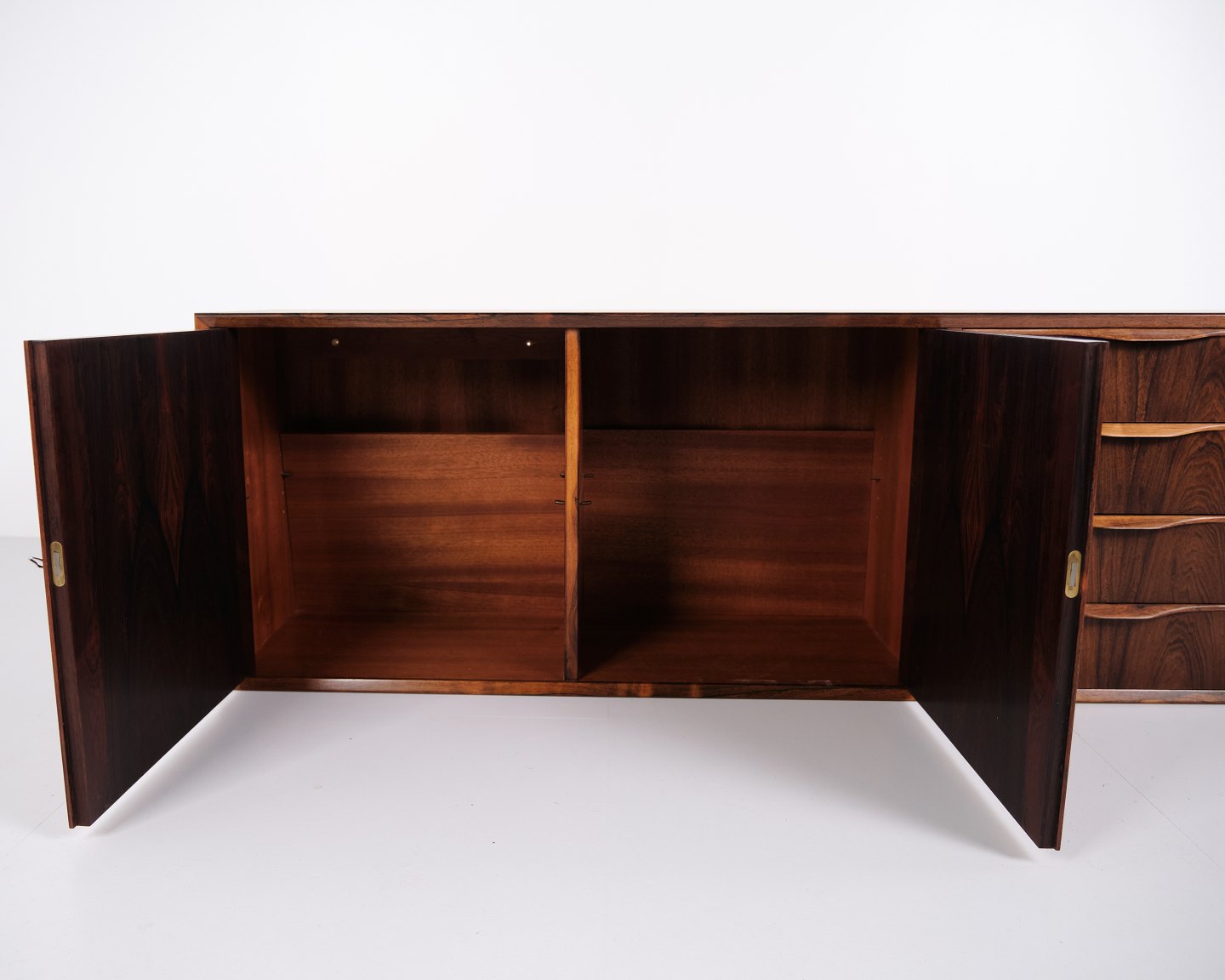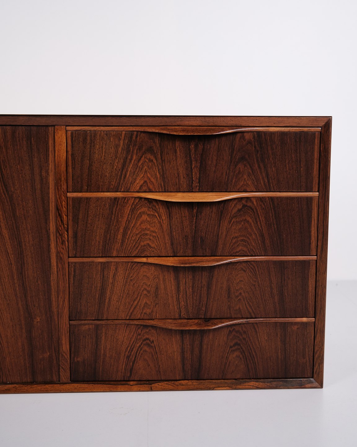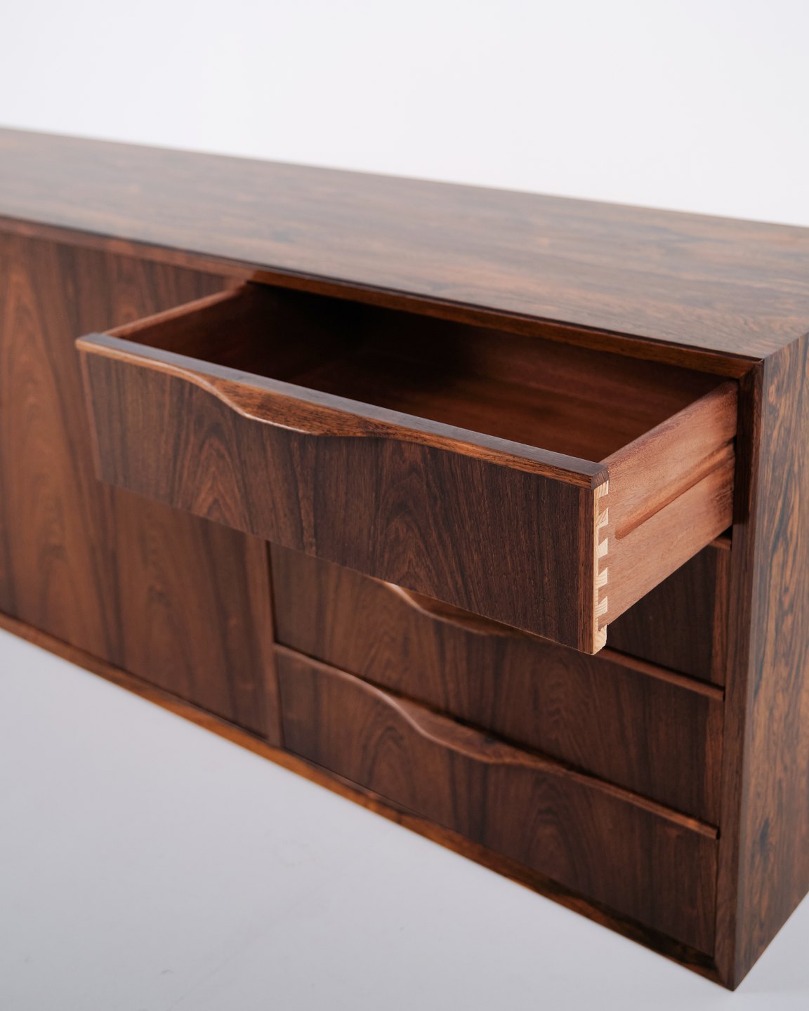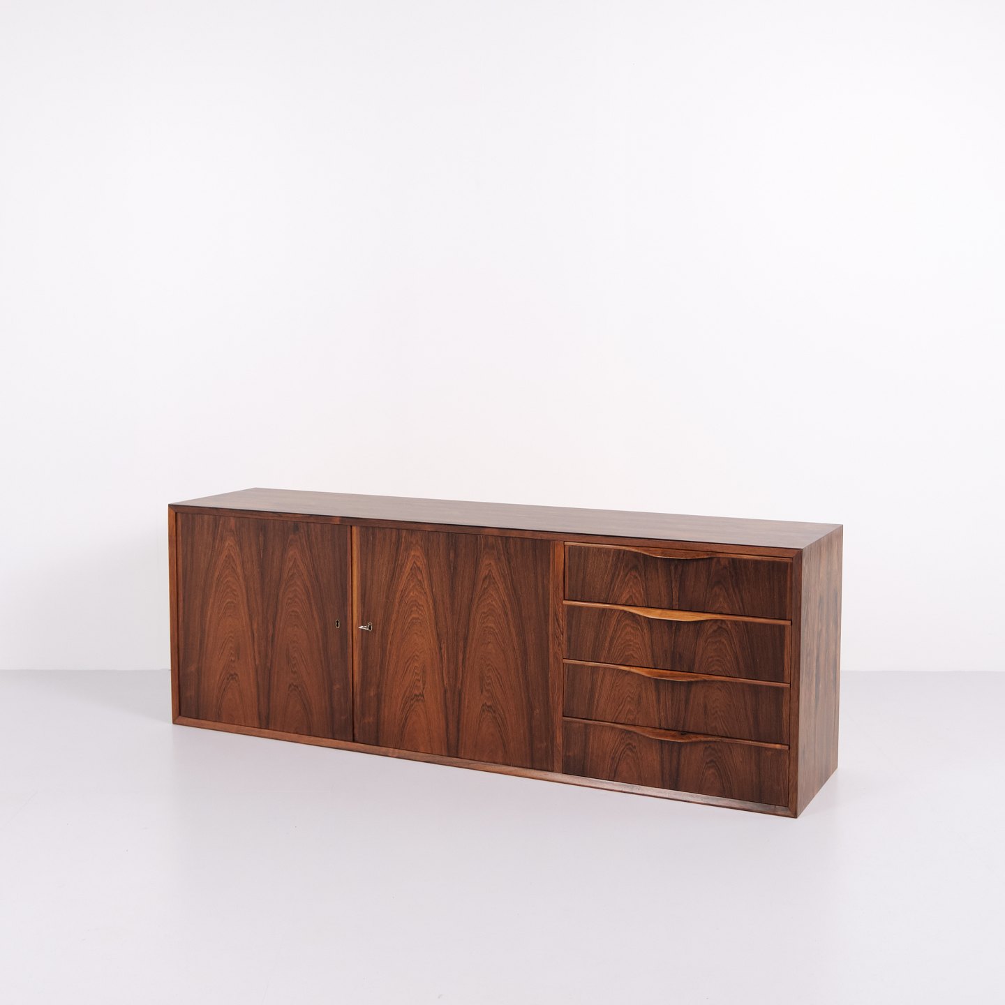 Væghængt skænk udført i palisander, designet af Erling Torvits og produceret hos Klim Møbelfabrik i 1950’erne. Skænken er karakteriseret ved et funktionelt ophængt design, der frigør gulvplads og var typisk for periodens danske møbelproduktion. Udførelsen i palisander understreger fokus på materialekvalitet og snedkerarbejde.— Designer: Erling Torvits