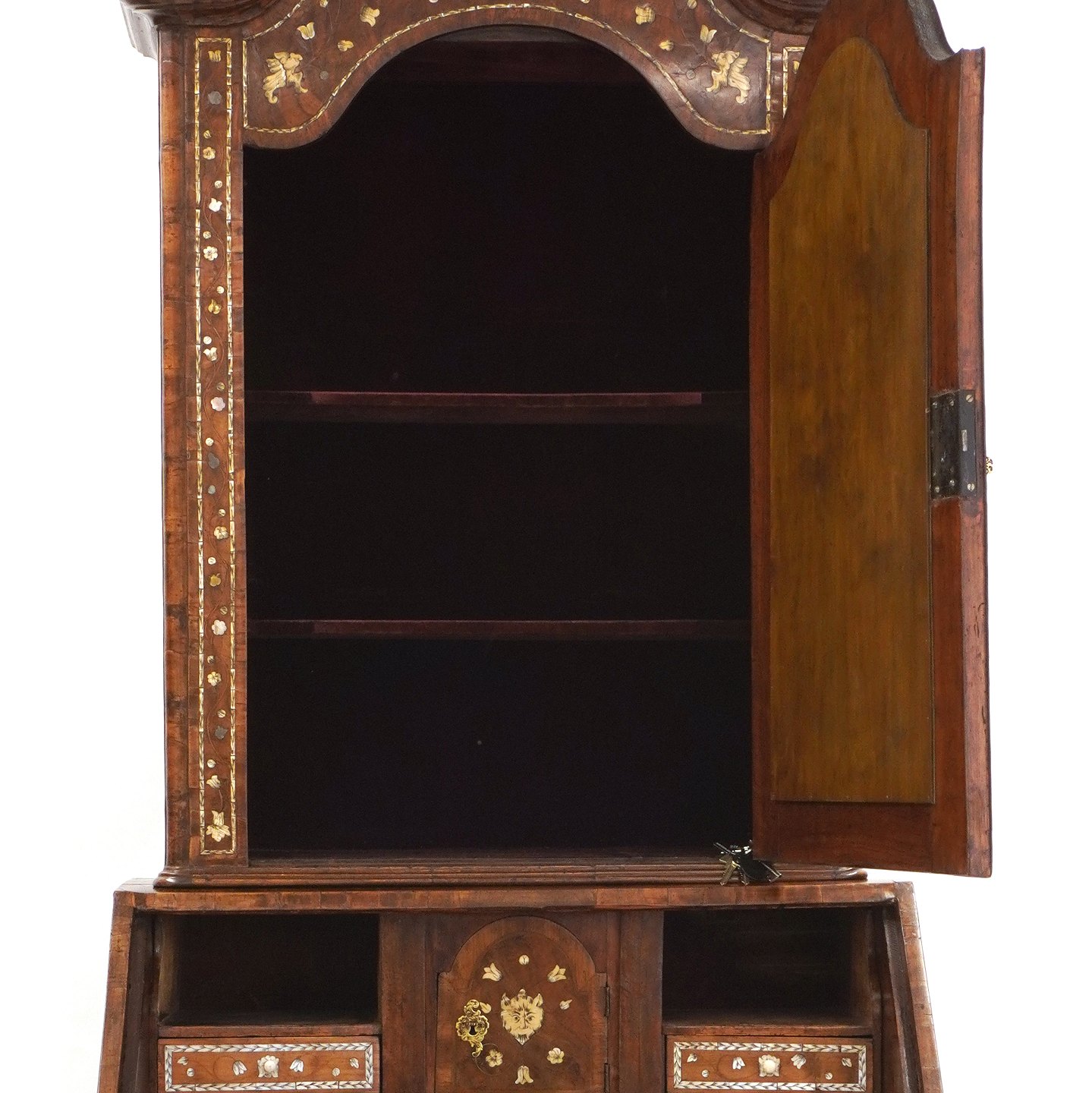 Venetiansk barokt pragtchatol i nøddetræ med talrige indlægningsarbejder. Overskab med spejl. Italien ca. år 1740. H: 235cm. B: 88cm. D: 78cm