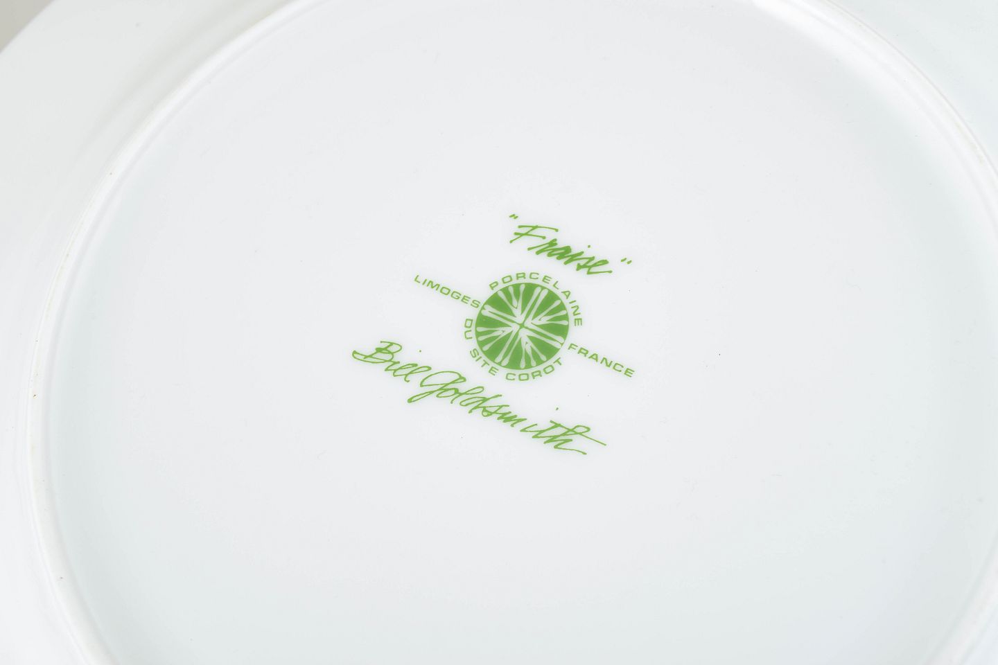 Bill Goldsmith for Limoges, Fraise, sæt på 4 dækketallerkener.Sæt på fire store dækketallerkener i porcelæn med dekoration af jordbær og blade samt grøn og rød kant i serien Fraise.