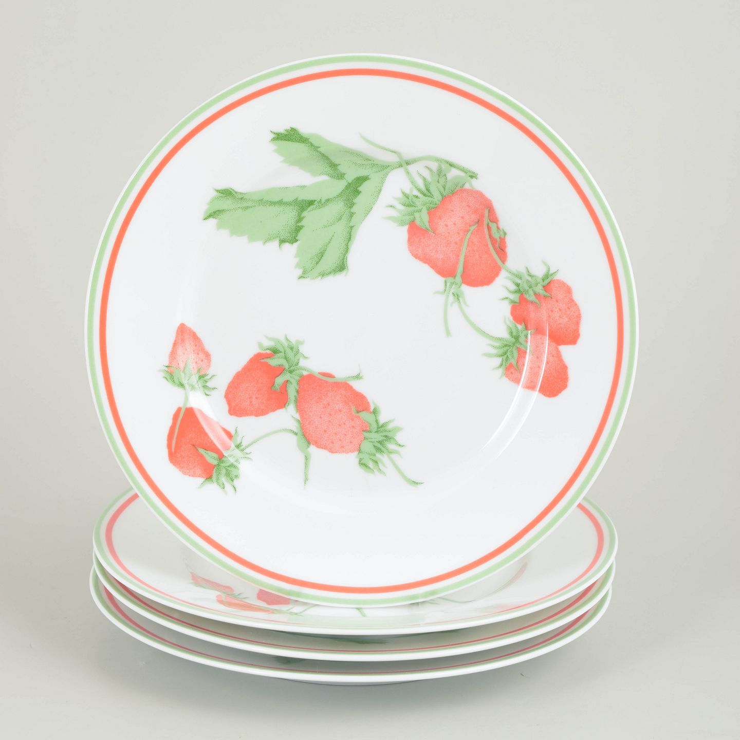 Bill Goldsmith for Limoges, Fraise, sæt på 4 frokosttallerkener.Sæt på fire frokosttallerkener i porcelæn med dekoration af jordbær og blade samt grøn og rød kant i serien Fraise.