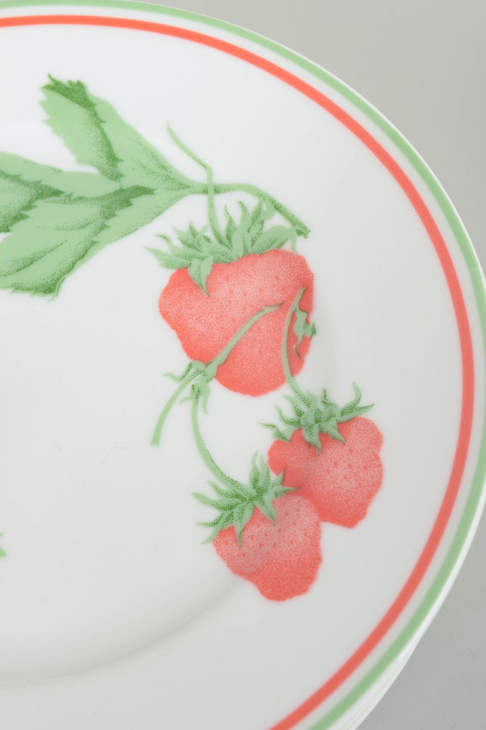 Limoges-porcelæn er kendt for sin fine kvalitet og lange tradition for dekoreret bordservice. I 1980’erne blev frugt- og botaniske motiver populære som et friskt og dekorativt indslag til det moderne dækkebord. Serien Fraise er karakteristisk for perioden med sit naturalistiske jordbærmotiv og farvede kanter, der giver et let og klassisk udtryk.