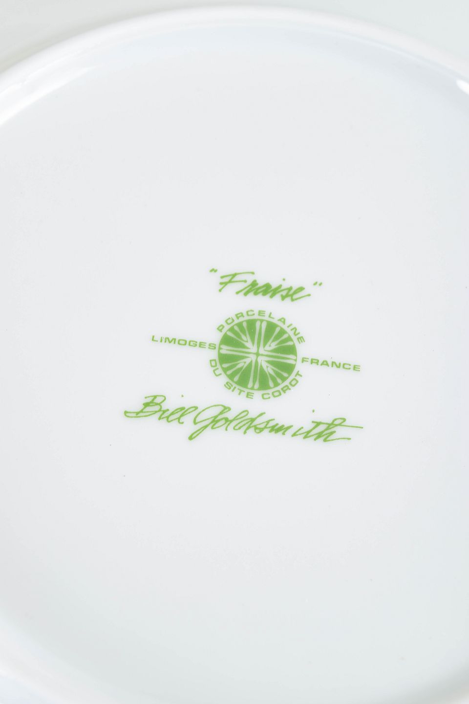Bill Goldsmith for Limoges, Fraise, sæt på 4 frokosttallerkener.Sæt på fire frokosttallerkener i porcelæn med dekoration af jordbær og blade samt grøn og rød kant i serien Fraise.